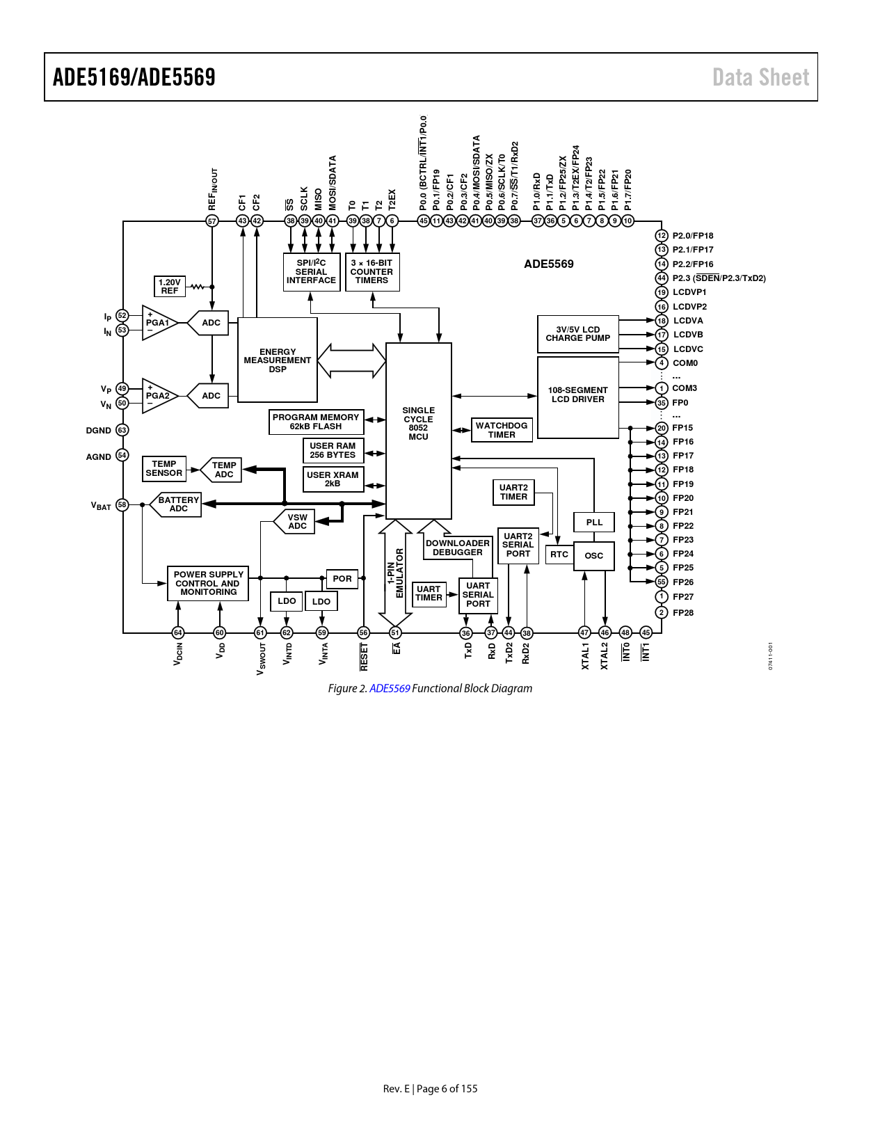 Figure 2. ADE5569 Functional Block Diagram Rev. E | Page 6 of 155 Document Outline GENERAL FEATURES ENERGY MEASUREMENT FEATURES MICROPROCESSOR FEATURES REVISION HISTORY GENERAL DESCRIPTION FUNCTIONAL BLOCK DIAGRAMS SPECIFICATIONS ENERGY METERING ANALOG PERIPHERALS DIGITAL INTERFACE TIMING SPECIFICATIONS ABSOLUTE MAXIMUM RATINGS THERMAL RESISTANCE ESD CAUTION PIN CONFIGURATIONS AND FUNCTION DESCRIPTIONS TYPICAL PERFORMANCE CHARACTERISTICS TERMINOLOGY SPECIAL FUNCTION REGISTER (SFR) MAPPING POWER MANAGEMENT POWER MANAGEMENT REGISTER DETAILS Writing to the Interrupt Pins Configuration SFR (INTPR, Address 0xFF) Clearing the Scratch Pad Registers (SCRATCH1, Address 0xFB to SCRATCH4, Address 0xFE) Writing to the Power Control SFR (POWCON, Address 0xC5) POWER SUPPLY ARCHITECTURE BATTERY SWITCHOVER Switching from VDD to VBAT Switching from VBAT to VDD POWER SUPPLY MANAGEMENT (PSM) INTERRUPT Battery Switchover and Power Supply Restored PSM Interrupt VDCINADC PSM Interrupt VBAT Monitor PSM Interrupt VDCIN Monitor PSM Interrupt SAG Monitor PSM Interrupt USING THE POWER SUPPLY FEATURES OPERATING MODES PSM0 (NORMAL MODE) PSM1 (BATTERY MODE) PSM2 (SLEEP MODE) 3.3 V PERIPHERALS AND WAKE-UP EVENTS TRANSITIONING BETWEEN OPERATING MODES Automatic Battery Switchover (PSM0 to PSM1) Entering Sleep Mode (PSM1 to PSM2) Servicing Wake-Up Events (PSM2 to PSM1) Automatic Switch to VDD (PSM2 to PSM0) Automatic Switch to VDD (PSM1 to PSM0) USING THE POWER MANAGEMENT FEATURES ENERGY MEASUREMENT ACCESS TO ENERGY MEASUREMENT SFRs ACCESS TO INTERNAL ENERGY MEASUREMENT REGISTERS Writing to the Internal Energy Measurement Registers Reading the Internal Energy Measurement Registers ENERGY MEASUREMENT REGISTERS ENERGY MEASUREMENT INTERNAL REGISTERS DETAILS INTERRUPT STATUS/ENABLE SFRS ANALOG INPUTS ANALOG-TO-DIGITAL CONVERSION Antialiasing Filter ADC Transfer Function Current Channel ADC Voltage Channel ADC Channel Sampling FAULT DETECTION (ADE5169 ONLY) Channel Selection Indication Fault Indication Fault with Active Input Greater Than Inactive Input Fault with Inactive Input Greater Than Active Input Calibration Concerns di/dt CURRENT SENSOR AND DIGITAL INTEGRATOR POWER QUALITY MEASUREMENTS Zero-Crossing Detection Zero-Crossing Timeout Period or Frequency Measurements Line Voltage SAG Detection SAG Level Set Peak Detection Peak Level Set Peak Level Record PHASE COMPENSATION RMS CALCULATION Current Channel RMS Calculation Current Channel RMS Offset Compensation Voltage Channel RMS Calculation Voltage Channel RMS Offset Compensation ACTIVE POWER CALCULATION Active Power Gain Calibration Active Power Offset Calibration Active Power Sign Detection Active Power No Load Detection ACTIVE ENERGY CALCULATION Integration Time Under Steady Load—Active Energy Active Energy Accumulation Modes Watt Signed Accumulation Mode Watt Positive Only Accumulation Mode Watt Absolute Accumulation Mode Active Energy Pulse Output Line Cycle Active Energy Accumulation Mode REACTIVE POWER CALCULATION Reactive Power Gain Calibration Reactive Power Offset Calibration Sign of Reactive Power Calculation Reactive Power Sign Detection Reactive Power No Load Detection REACTIVE ENERGY CALCULATION Integration Time Under Steady Load—Reactive Energy Reactive Energy Accumulation Modes Var Signed Accumulation Mode Var Antitamper Accumulation Mode Var Absolute Accumulation Mode Reactive Energy Pulse Output Line Cycle Reactive Energy Accumulation Mode APPARENT POWER CALCULATION Apparent Power Offset Calibration APPARENT ENERGY CALCULATION Integration Times Under Steady Load—Apparent Energy Apparent Energy Pulse Output Line Cycle Apparent Energy Accumulation Mode Apparent Power No Load Detection AMPERE-HOUR ACCUMULATION ENERGY TO FREQUENCY CONVERSION Pulse Output Configuration Pulse Output Characteristic ENERGY REGISTER SCALING ENERGY MEASUREMENT INTERRUPTS TEMPERATURE, BATTERY, AND SUPPLY VOLTAGE MEASUREMENTS TEMPERATURE MEASUREMENT Single Temperature Measurement Background Temperature Measurements Temperature ADC in PSM0, PSM1, and PSM2 Modes Temperature ADC Interrupt BATTERY MEASUREMENT Single Battery Measurement Background Battery Measurements Battery ADC in PSM0, PSM1, and PSM2 Modes Battery ADC Interrupt EXTERNAL VOLTAGE MEASUREMENT Single External Voltage Measurement Background External Voltage Measurements External Voltage ADC in PSM1 and PSM2 Modes External Voltage ADC Interrupt 8052 MCU CORE ARCHITECTURE MCU REGISTERS BASIC 8052 REGISTERS Program Counter (PC) Instruction Register (IR) Register Banks Accumulator B Register Program Status Word (PSW) Data Pointer (DPTR) Stack Pointer (SP) Stack Boundary Protection STANDARD 8052 SFRS Timer SFRs Serial Port SFRs Interrupt SFR I/O Port SFRs Power Control Register (PCON, Address 0x87) MEMORY OVERVIEW General-Purpose RAM Special Function Registers (SFRs) Extended Internal RAM (XRAM) Code Memory ADDRESSING MODES Immediate Addressing Direct Addressing Indirect Addressing Extended Direct Addressing Extended Indirect Addressing Code Indirect Addressing INSTRUCTION SET READ-MODIFY-WRITE INSTRUCTIONS INSTRUCTIONS THAT AFFECT FLAGS ADD A, Source ADDC A, Source SUBB A, Source MUL AB DIV AB DA A RRC A RLC A CJNE Destination, Source, Relative Jump DUAL DATA POINTERS INTERRUPT SYSTEM STANDARD 8052 INTERRUPT ARCHITECTURE INTERRUPT ARCHITECTURE INTERRUPT REGISTERS INTERRUPT PRIORITY INTERRUPT FLAGS INTERRUPT VECTORS INTERRUPT LATENCY CONTEXT SAVING WATCHDOG TIMER WRITING TO THE WATCHDOG TIMER SFR (WDCON, ADDRESS 0xC0) WATCHDOG TIMER INTERRUPT LCD DRIVER LCD REGISTERS LCD SETUP LCD TIMING AND WAVEFORMS Software Controlled Blink Mode Automatic Blink Mode SCROLLING MODE Automatic Scrolling Mode DISPLAY ELEMENT CONTROL Writing to LCD Data Registers Reading LCD Data Registers VOLTAGE GENERATION Lifetime Performance Power Consumption Contrast Control Lifetime Performance LCD EXTERNAL CIRCUITRY Charge Pump External Resistor Ladder LCD FUNCTION IN PSM2 MODE Example LCD Setup FLASH MEMORY FLASH MEMORY OVERVIEW Flash/EE Memory Re