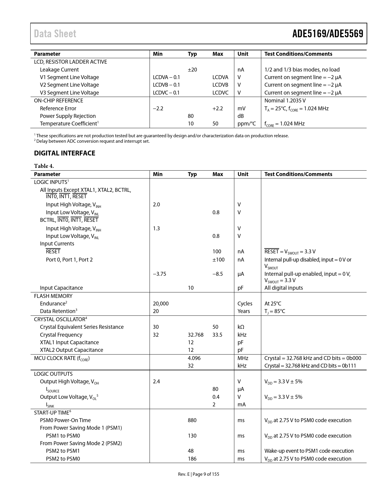 Data Sheet. ADE5169/ADE5569. Parameter. Min. Typ. Max. Unit. Test Conditions/Comments. DIGITAL INTERFACE. Table 4. Parameter