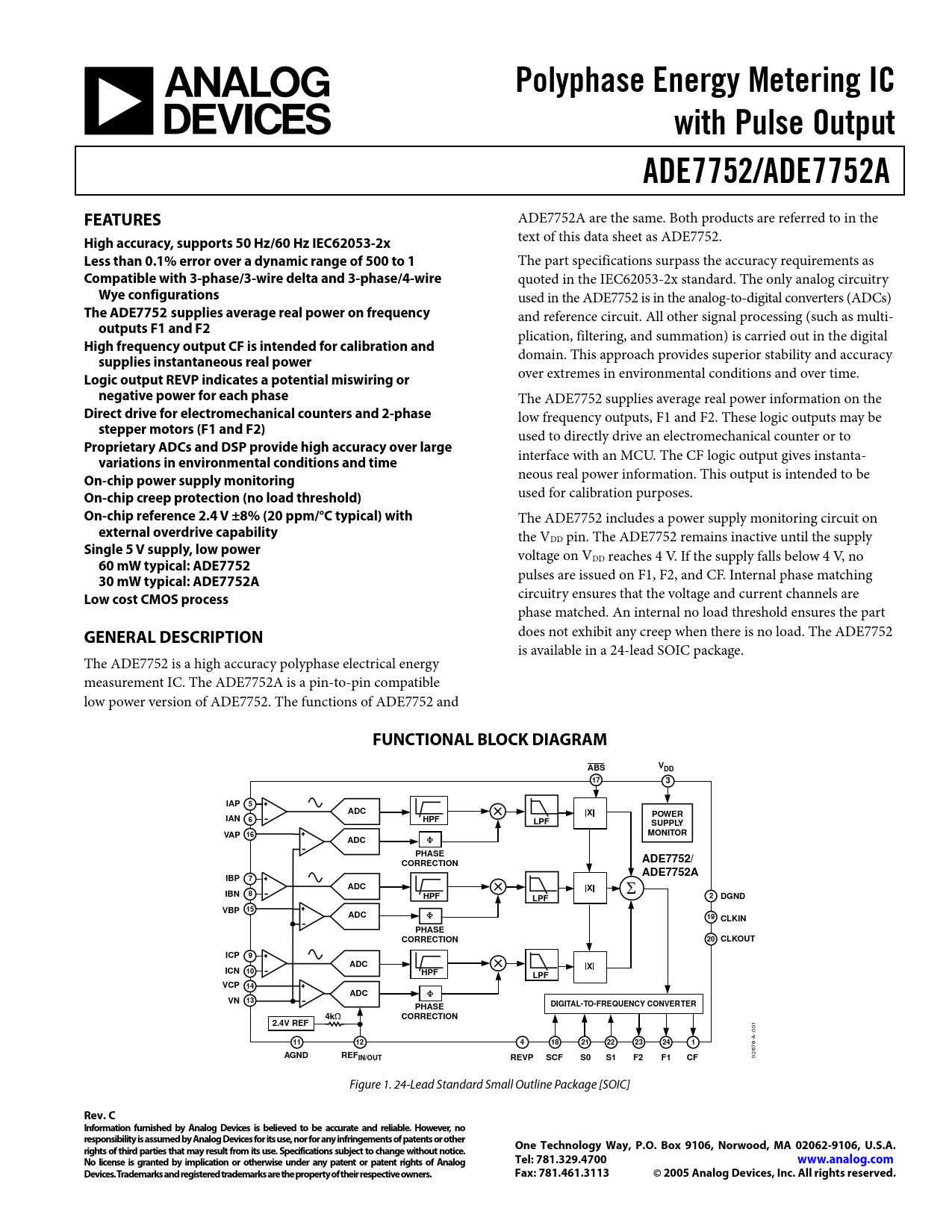 does not exhibit any creep when there is no load. The ADE7752 is available in a 24-lead SOIC package. The ADE7752 is a high accuracy polyphase electrical energy measurement IC. The ADE7752A is a pin-to-pin compatible low power version of ADE7752. The functions of ADE7752 and