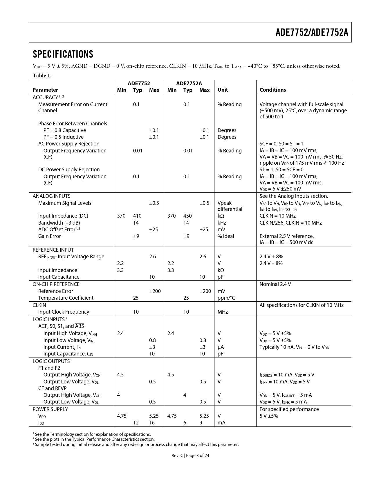 link to page 3 link to page 3 link to page 14 link to page 3 link to page 3 link to page 3 link to page 3 ADE7752/ADE7752ASPECIFICATIONS VDD = 5 V ± 5%, AGND = DGND = 0 V, on-chip reference, CLKIN = 10 MHz, TMIN to TMAX = –40°C to +85°C, unless otherwise noted. Table 1.ADE7752 ADE7752AParameterMinTyp Max MinTypMaxUnit Conditions ACCURACY1, 2 Measurement Error on Current 0.1 0.1 % Reading Voltage channel with full-scale signal Channel (±500 mV), 25°C, over a dynamic range of 500 to 1 Phase Error Between Channels PF = 0.8 Capacitive ±0.1 ±0.1 Degrees PF = 0.5 Inductive ±0.1 ±0.1 Degrees AC Power Supply Rejection SCF = 0; S0 = S1 = 1 Output Frequency Variation 0.01 0.01 % Reading IA = IB = IC = 100 mV rms, (CF) VA = VB = VC = 100 mV rms, @ 50 Hz, ripple on VDD of 175 mV rms @ 100 Hz DC Power Supply Rejection S1 = 1; S0 = SCF = 0 Output Frequency Variation 0.1 0.1 % Reading IA = IB = IC = 100 mV rms, (CF) VA = VB = VC = 100 mV rms, VDD = 5 V ±250 mV ANALOG INPUTS See the Analog Inputs section. Maximum Signal Levels ±0.5 ±0.5 Vpeak VAP to VN, VBP to VN, VCP to VN, IAP to IAN, differential IBP to IBN, ICP to ICN Input Impedance (DC) 370 410 370 450 kΩ CLKIN = 10 MHz Bandwidth (–3 dB) 14 14 kHz CLKIN/256, CLKIN = 10 MHz ADC Offset Error1, 2 ±25 ±25 mV Gain Error ±9 ±9 % Ideal External 2.5 V reference, IA = IB = IC = 500 mV dc REFERENCE INPUT REFIN/OUT Input Voltage Range 2.6 2.6 V 2.4 V + 8% 2.2 2.2 V 2.4 V – 8% Input Impedance 3.3 3.3 kΩ Input Capacitance 10 10 pF ON-CHIP REFERENCE Nominal 2.4 V Reference Error ±200 ±200 mV Temperature Coefficient 25 25 ppm/°C CLKIN All specifications for CLKIN of 10 MHz Input Clock Frequency 10 10 MHz LOGIC INPUTS3 ACF, S0, S1, and ABS Input High Voltage, VINH 2.4 2.4 V VDD = 5 V ±5% Input Low Voltage, VINL 0.8 0.8 V VDD = 5 V ±5% Input Current, IIN ±3 ±3 μA Typically 10 nA, VIN = 0 V to VDD Input Capacitance, CIN 10 10 pF LOGIC OUTPUTS3 F1 and F2 Output High Voltage, VOH 4.5 4.5 V ISOURCE = 10 mA, VDD = 5 V Output Low Voltage, VOL 0.5 0.5 V ISINK = 10 mA, VDD = 5 V CF and REVP Output High Voltage, VOH 4 4 V VDD = 5 V, ISOURCE = 5 mA Output Low Voltage, VOL 0.5 0.5 V VDD = 5 V, ISINK = 5 mA POWER SUPPLY For specified performance VDD 4.75 5.25 4.75 5.25 V 5 V ±5% IDD 12 16 6 9 mA 1 See the Terminology section for explanation of specifications. 2 See the plots in the Typical Performance Characteristics section. 3 Sample tested during initial release and after any redesign or process change that may affect this parameter. Rev. C | Page 3 of 24 Document Outline FEATURES GENERAL DESCRIPTION FUNCTIONAL BLOCK DIAGRAM SPECIFICATIONS TIMING CHARACTERISTICS ABSOLUTE MAXIMUM RATINGS ESD CAUTION PIN CONFIGURATION AND FUNCTION DESCRIPTIONS TYPICAL PERFORMANCE CHARACTERISTICS TEST CIRCUIT TERMINOLOGY THEORY OF OPERATION POWER FACTOR CONSIDERATIONS NONSINUSOIDAL VOLTAGE AND CURRENT ANALOG INPUTS CURRENT CHANNELS VOLTAGE CHANNELS TYPICAL CONNECTION DIAGRAMS CURRENT CHANNEL CONNECTION VOLTAGE CHANNELS CONNECTION METER CONNECTIONS POWER SUPPLY MONITOR HPF AND OFFSET EFFECTS DIGITAL-TO-FREQUENCY CONVERSION MODE SELECTION OF THE SUM OF THE THREE ACTIVE ENERGIES POWER MEASUREMENT CONSIDERATIONS TRANSFER FUNCTION FREQUENCY OUTPUTS F1 AND F2 FREQUENCY OUTPUT CF SELECTING A FREQUENCY FOR AN ENERGY METER APPLICATION FREQUENCY OUTPUTS NO LOAD THRESHOLD NEGATIVE POWER INFORMATION OUTLINE DIMENSIONS ORDERING GUIDE