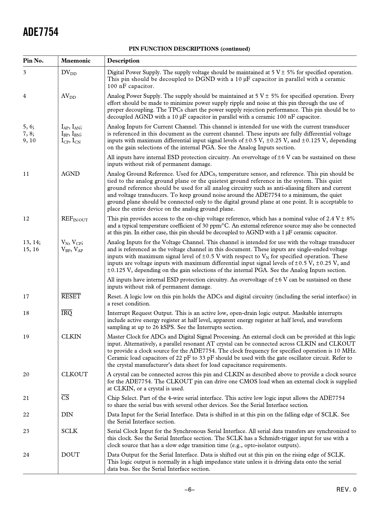 ADE7754. PIN FUNCTION DESCRIPTIONS (continued). Pin No. Mnemonic. Description