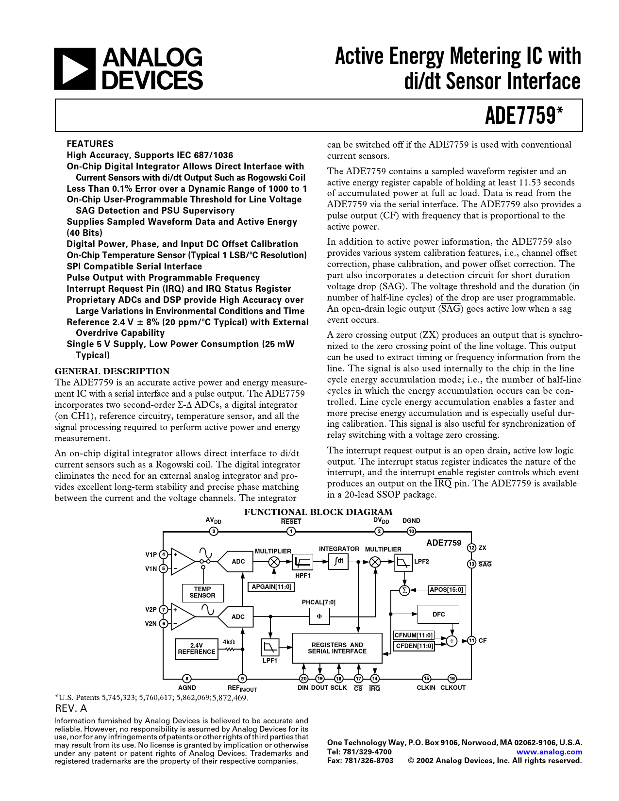 Active Energy Metering IC with. di/dt Sensor Interface. ADE7759*. FEATURES. High Accuracy, Supports IEC 687/1036