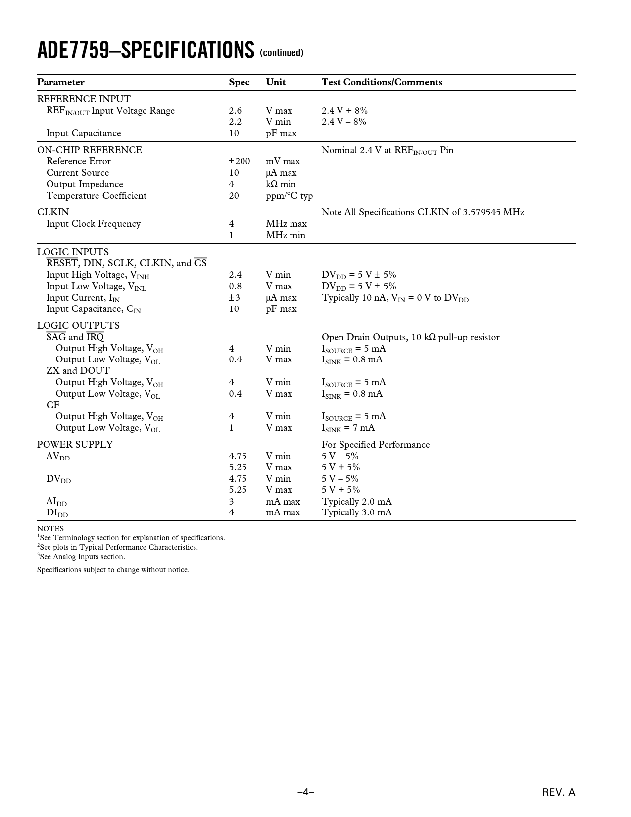 ADE7759–SPECIFICATIONS (continued). Parameter. Spec. Unit. Test Conditions/Comments