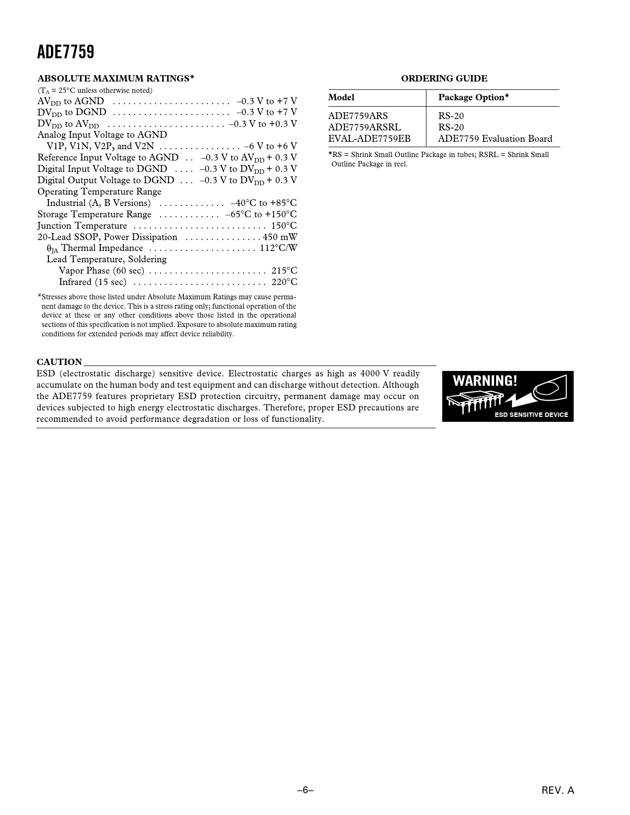 ADE7759ABSOLUTE MAXIMUM RATINGS*ORDERING GUIDE (TA = 25∞C unless otherwise noted) AV ModelPackage Option* DD to AGND . –0.3 V to +7 V DVDD to DGND . –0.3 V to +7 V ADE7759ARS RS-20 DVDD to AVDD . –0.3 V to +0.3 V ADE7759ARSRL RS-20 Analog Input Voltage to AGND EVAL-ADE7759EB ADE7759 Evaluation Board V1P, V1N, V2P, and V2N . –6 V to +6 V Reference Input Voltage to AGND . –0.3 V to AV * RS = Shrink Small Outline Package in tubes; RSRL = Shrink Small DD + 0.3 V Outline Package in reel. Digital Input Voltage to DGND . –0.3 V to DVDD + 0.3 V Digital Output Voltage to DGND . –0.3 V to DVDD + 0.3 V Operating Temperature Range Industrial (A, B Versions) . –40∞C to +85∞C Storage Temperature Range . –65∞C to +150∞C Junction Temperature . 150∞C 20-Lead SSOP, Power Dissipation . 450 mW qJA Thermal Impedance . 112∞C/W Lead Temperature, Soldering Vapor Phase (60 sec) . 215∞C Infrared (15 sec) . 220∞C *Stresses above those listed under Absolute Maximum Ratings may cause perma- nent damage to the device. This is a stress rating only; functional operation of the device at these or any other conditions above those listed in the operational sections of this specification is not implied. Exposure to absolute maximum rating conditions for extended periods may affect device reliability. CAUTION ESD (electrostatic discharge) sensitive device. Electrostatic charges as high as 4000 V readily accumulate on the human body and test equipment and can discharge without detection. Although WARNING! the ADE7759 features proprietary ESD protection circuitry, permanent damage may occur on devices subjected to high energy electrostatic discharges. Therefore, proper ESD precautions are ESD SENSITIVE DEVICE recommended to avoid performance degradation or loss of functionality. –6– REV. A Document Outline FEATURES GENERAL DESCRIPTION FUNCTIONAL BLOCK DIAGRAM TABLE OF CONTENTS SPECIFICATIONS TIMING CHARACTERISTICS ABSOLUTE MAXIMUM RATINGS ORDERING GUIDE PIN CONFIGURATION PIN FUNCTION DESCRIPTIONS TERMINOLOGY MEASUREMENT ERROR PHASE ERROR BETWEEN CHANNELS POWER SUPPLY REJECTION ADC OFFSET ERROR GAIN ERROR GAIN ERROR MATCH Typical Performance Characteristics Test Circuits ANALOG INPUTS di/dt CURRENT SENSOR AND DIGITAL INTEGRATOR ZERO CROSSING DETECTION LINE VOLTAGE SAG DETECTION Sag Level Set POWER SUPPLY MONITOR INTERRUPTS Using the ADE7759 Interrupts with an MCU Interrupt Timing TEMPERATURE MEASUREMENT ANALOG-TO-DIGITAL CONVERSION Antialias Filter ADC Transfer Function Reference Circuit CHANNEL 1 ADC Channel 1 ADC Gain Adjust Channel 1 Sampling CHANNEL 1 AND CHANNEL 2 WAVEFORM SAMPLING MODE CHANNEL 2 ADC Channel 2 Sampling PHASE COMPENSATION ACTIVE POWER CALCULATION ENERGY CALCULATION Integration Time under Steady Load POWER OFFSET CALIBRATION ENERGY-TO-FREQUENCY CONVERSION LINE CYCLE ENERGY ACCUMULATION MODE CALIBRATING THE ENERGY METER Calculating the Average Active Power Calibrating the Frequency at CF Energy Meter Display CLKIN FREQUENCY SUSPENDING THE ADE7759 FUNCTIONALITY APPLICATION INFORMATION SERIAL INTERFACE Serial Write Operation Serial Read Operation CHECKSUM REGISTER REGISTER DESCRIPTIONS Communications Register Mode Register (06H) Interrupt Status Register (04H) Reset Interrupt Status Register (05H) CH1OS Register (08H) OUTLINE DIMENSIONS Revision History