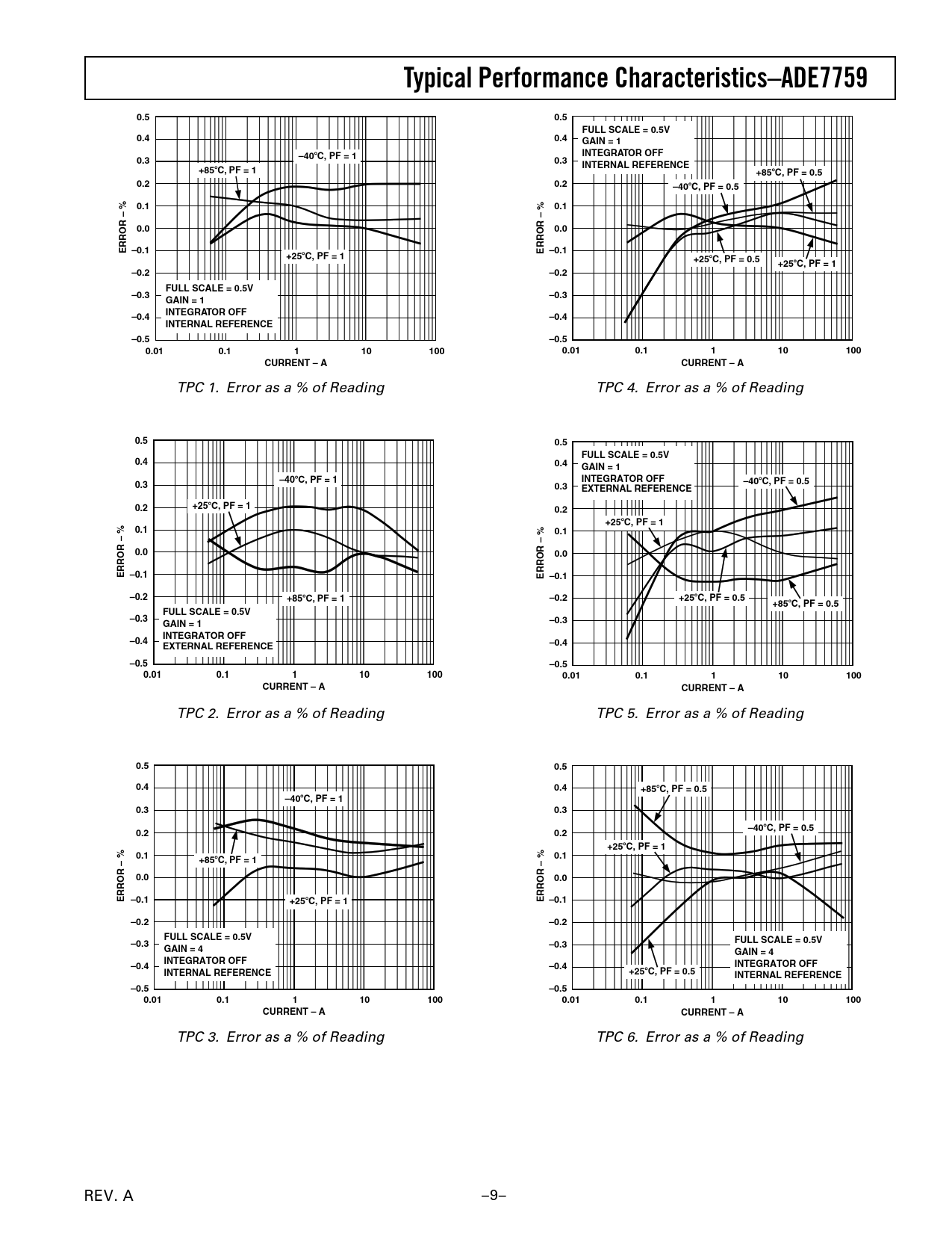 TADE7759ypical Performance Characteristics–0.50.5FULL SCALE = 0.5V0.40.4GAIN = 1–40C, PF = 1INTEGRATOR OFF0.30.3INTERNAL REFERENCE+85C, PF = 1+85C, PF = 0.50.20.2–40C, PF = 0.50.10.10.00.0ERROR – % –0.1ERROR – % –0.1+25C, PF = 1+25C, PF = 0.5+25C, PF = 1–0.2–0.2FULL SCALE = 0.5V–0.3–0.3GAIN = 1 INTEGRATOR OFF–0.4–0.4INTERNAL REFERENCE–0.5–0.50.010.11101000.010.1110100CURRENT – ACURRENT – A TPC 1. Error as a % of Reading TPC 4. Error as a % of Reading 0.50.5FULL SCALE = 0.5V0.40.4GAIN = 1–40C, PF = 1INTEGRATOR OFF0.3–40C, PF = 0.50.3EXTERNAL REFERENCE0.2+25C, PF = 10.2+25C, PF = 10.10.10.00.0ERROR – % –0.1ERROR – % –0.1–0.2+85C, PF = 1–0.2+25C, PF = 0.5+85C, PF = 0.5FULL SCALE = 0.5V–0.3GAIN = 1–0.3INTEGRATOR OFF–0.4EXTERNAL REFERENCE–0.4–0.5–0.50.010.11101000.010.1110100CURRENT – ACURRENT – A TPC 2. Error as a % of Reading TPC 5. Error as a % of Reading 0.50.50.40.4+85C, PF = 0.5–40C, PF = 10.30.3–40C, PF = 0.50.20.2+25C, PF = 10.10.1+85C, PF = 10.00.0ERROR – % –0.1+25C, PF = 1ERROR – % –0.1–0.2–0.2FULL SCALE = 0.5V–0.3FULL SCALE = 0.5V–0.3GAIN = 4GAIN = 4INTEGRATOR OFF–0.4–0.4INTEGRATOR OFFINTERNAL REFERENCE+25C, PF = 0.5INTERNAL REFERENCE–0.5–0.50.010.11101000.010.1110100CURRENT – ACURRENT – A TPC 3. Error as a % of Reading TPC 6. Error as a % of Reading REV. A –9– Document Outline FEATURES GENERAL DESCRIPTION FUNCTIONAL BLOCK DIAGRAM TABLE OF CONTENTS SPECIFICATIONS TIMING CHARACTERISTICS ABSOLUTE MAXIMUM RATINGS ORDERING GUIDE PIN CONFIGURATION PIN FUNCTION DESCRIPTIONS TERMINOLOGY MEASUREMENT ERROR PHASE ERROR BETWEEN CHANNELS POWER SUPPLY REJECTION ADC OFFSET ERROR GAIN ERROR GAIN ERROR MATCH Typical Performance Characteristics Test Circuits ANALOG INPUTS di/dt CURRENT SENSOR AND DIGITAL INTEGRATOR ZERO CROSSING DETECTION LINE VOLTAGE SAG DETECTION Sag Level Set POWER SUPPLY MONITOR INTERRUPTS Using the ADE7759 Interrupts with an MCU Interrupt Timing TEMPERATURE MEASUREMENT ANALOG-TO-DIGITAL CONVERSION Antialias Filter ADC Transfer Function Reference Circuit CHANNEL 1 ADC Channel 1 ADC Gain Adjust Channel 1 Sampling CHANNEL 1 AND CHANNEL 2 WAVEFORM SAMPLING MODE CHANNEL 2 ADC Channel 2 Sampling PHASE COMPENSATION ACTIVE POWER CALCULATION ENERGY CALCULATION Integration Time under Steady Load POWER OFFSET CALIBRATION ENERGY-TO-FREQUENCY CONVERSION LINE CYCLE ENERGY ACCUMULATION MODE CALIBRATING THE ENERGY METER Calculating the Average Active Power Calibrating the Frequency at CF Energy Meter Display CLKIN FREQUENCY SUSPENDING THE ADE7759 FUNCTIONALITY APPLICATION INFORMATION SERIAL INTERFACE Serial Write Operation Serial Read Operation CHECKSUM REGISTER REGISTER DESCRIPTIONS Communications Register Mode Register (06H) Interrupt Status Register (04H) Reset Interrupt Status Register (05H) CH1OS Register (08H) OUTLINE DIMENSIONS Revision History