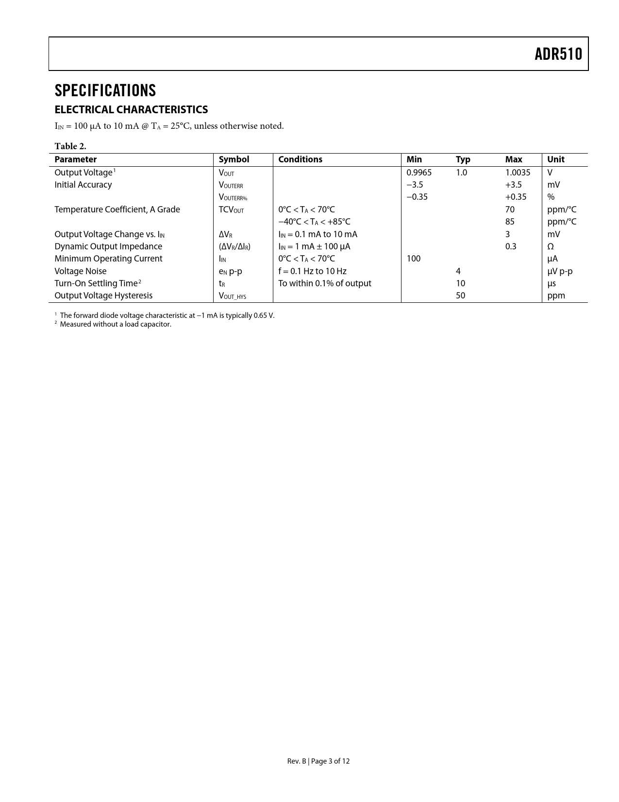 ADR510 SPECIFICATIONS ELECTRICAL CHARACTERISTICS Table 2 Parameter Symbol Conditions Min Typ Max Unit