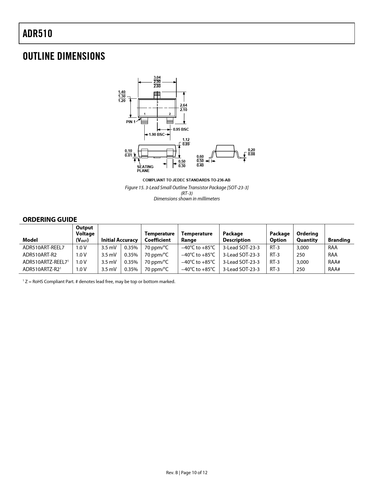 link to page 10 link to page 10 ADR510OUTLINE DIMENSIONS3.04 2.90 2.801.40 1.30 1.2032.64 2.1012PIN 10.95 BSC1.90 BSC1.12 0.890.100.200.010.080.600.500.50SEATING0.300.40PLANECOMPLIANT TO JEDEC STANDARDS TO-236-AB Figure 15. 3-Lead Small Outline Transistor Package [SOT-23-3] (RT-3) Dimensions shown in millimeters ORDERING GUIDEOutput VoltageTemperatureTemperaturePackagePackageOrderingModel(VOUT)Initial AccuracyCoefficientRangeDescriptionOptionQuantityBranding ADR510ART-REEL7 1.0 V 3.5 mV 0.35% 70 ppm/°C −40°C to +85°C 3-Lead SOT-23-3 RT-3 3,000 RAA ADR510ART-R2 1.0 V 3.5 mV 0.35% 70 ppm/°C −40°C to +85°C 3-Lead SOT-23-3 RT-3 250 RAA ADR510ARTZ-REEL71 1.0 V 3.5 mV 0.35% 70 ppm/°C −40°C to +85°C 3-Lead SOT-23-3 RT-3 3,000 RAA# ADR510ARTZ-R21 1.0 V 3.5 mV 0.35% 70 ppm/°C −40°C to +85°C 3-Lead SOT-23-3 RT-3 250 RAA# 1 Z = RoHS Compliant Part. # denotes lead free, may be top or bottom marked. Rev. B | Page 10 of 12 Document Outline FEATURES APPLICATIONS PIN CONFIGURATION GENERAL DESCRIPTION TABLE OF CONTENTS REVISION HISTORY SPECIFICATIONS ELECTRICAL CHARACTERISTICS ABSOLUTE MAXIMUM RATINGS THERMAL RESISTANCE ESD CAUTION TYPICAL PERFORMANCE CHARACTERISTICS PARAMETER DEFINITIONS TEMPERATURE COEFFICIENT THERMAL HYSTERESIS APPLICATIONS INFORMATION ADJUSTABLE PRECISION VOLTAGE SOURCE OUTPUT VOLTAGE TRIM USING THE ADR510 WITH PRECISION DATA CONVERTERS PRECISE NEGATIVE VOLTAGE REFERENCE OUTLINE DIMENSIONS ORDERING GUIDE