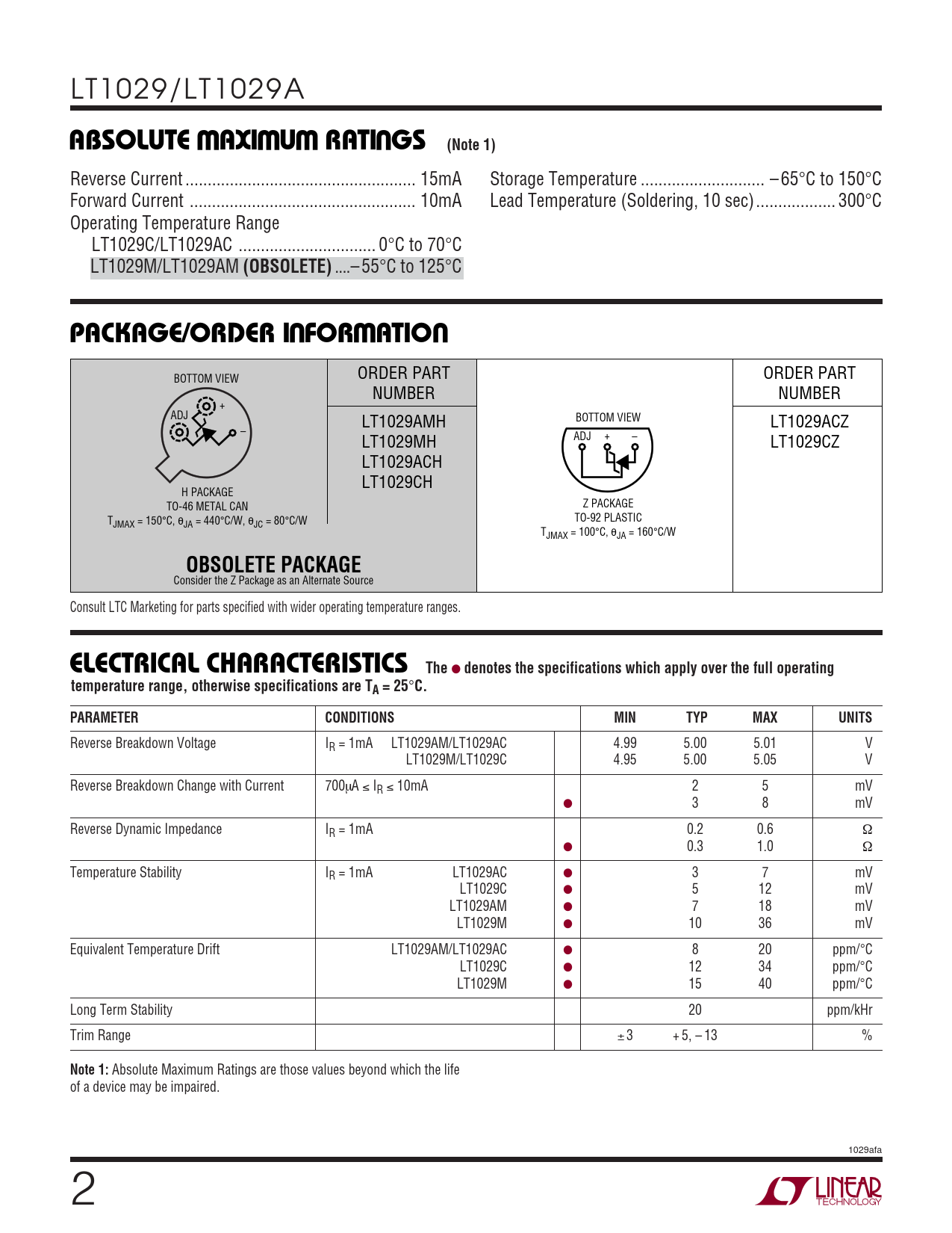 LT1029/LT1029A WWWUABSOLUTE AXI U RATI GS (Note 1) Reverse Current .. 15mA Storage Temperature .. – 65°C to 150°C Forward Current ... 10mA Lead Temperature (Soldering, 10 sec).. 300°C Operating Temperature Range LT1029C/LT1029AC ... 0°C to 70°C LT1029M/LT1029AM (OBSOLETE) ..– 55°C to 125°C UWUPACKAGE/ORDER I FOR ATIO ORDER PART ORDER PART BOTTOM VIEW NUMBER NUMBER + ADJ LT1029AMH BOTTOM VIEW LT1029ACZ – LT1029MH ADJ + – LT1029CZ LT1029ACH LT1029CH H PACKAGE TO-46 METAL CAN Z PACKAGE T TO-92 PLASTIC JMAX = 150°C, θJA = 440°C/W, θJC = 80°C/W TJMAX = 100°C, θJA = 160°C/W OBSOLETE PACKAGE Consider the Z Package as an Alternate Source Consult LTC Marketing for parts specified with wider operating temperature ranges. ELECTRICAL CHARACTERISTICS The ● denotes the specifications which apply over the full operatingtemperature range, otherwise specifications are TA = 25 ° C.PARAMETERCONDITIONSMINTYPMAXUNITS Reverse Breakdown Voltage IR = 1mA LT1029AM/LT1029AC 4.99 5.00 5.01 V LT1029M/LT1029C 4.95 5.00 5.05 V Reverse Breakdown Change with Current 700µA ≤ IR ≤ 10mA 2 5 mV ● 3 8 mV Reverse Dynamic Impedance IR = 1mA 0.2 0.6 Ω ● 0.3 1.0 Ω Temperature Stability IR = 1mA LT1029AC ● 3 7 mV LT1029C ● 5 12 mV LT1029AM ● 7 18 mV LT1029M ● 10 36 mV Equivalent Temperature Drift LT1029AM/LT1029AC ● 8 20 ppm/°C LT1029C ● 12 34 ppm/°C LT1029M ● 15 40 ppm/°C Long Term Stability 20 ppm/kHr Trim Range ± 3 + 5, – 13 % Note 1: Absolute Maximum Ratings are those values beyond which the life of a device may be impaired. 1029afa 2