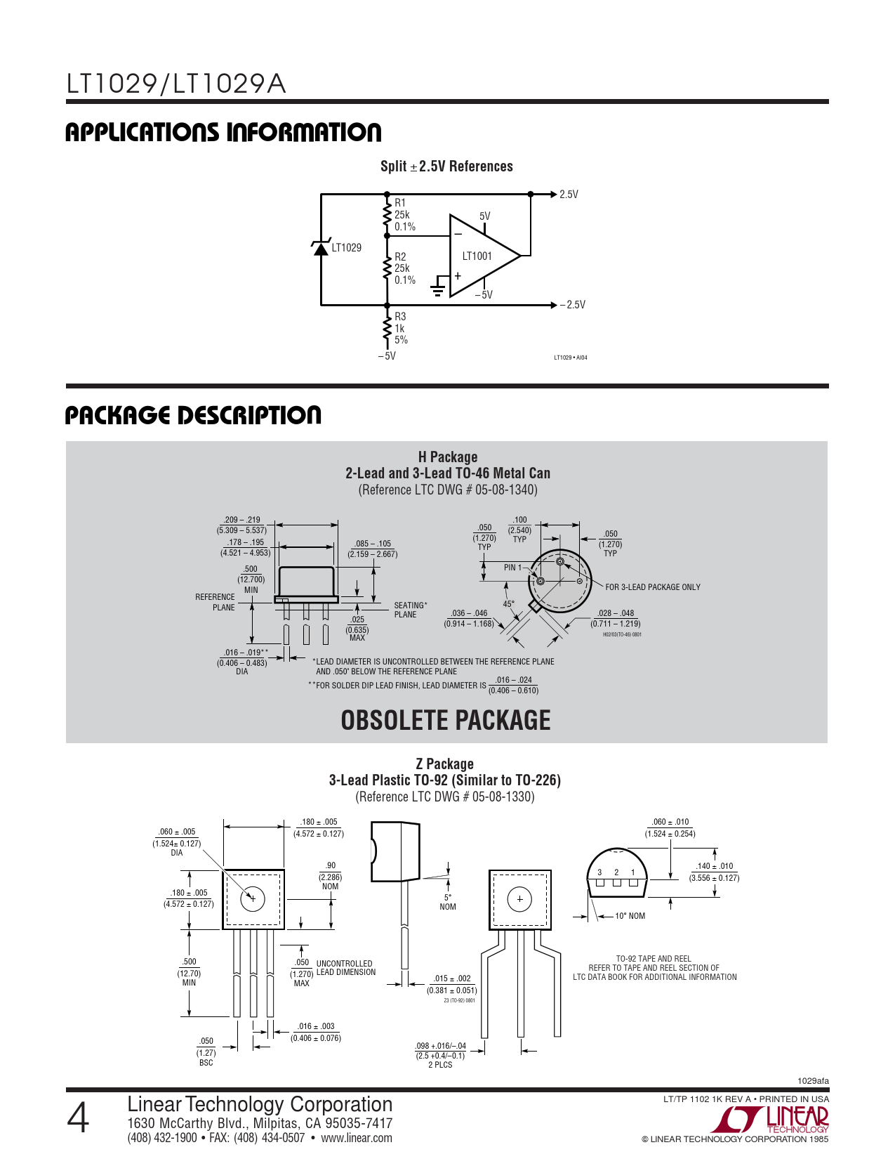 APPLICATIO S I FOR ATIO. Split. 2.5V References. PACKAGE DESCRIPTIO. H Package. 2-Lead and 3-Lead TO-46 Metal Can. OBSOLETE PACKAGE
