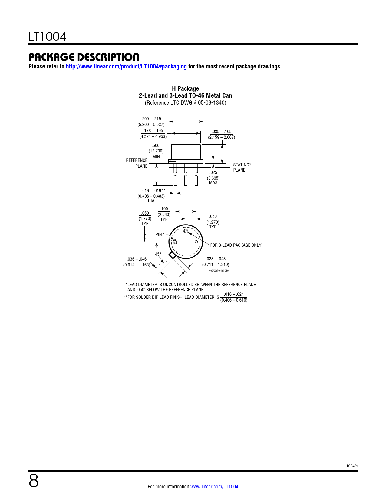 package DescripTion Please refer to http://www.linear.com/product/LT1004#packaging for the most recent package drawings. H Package 2-Lead and 3-Lead TO-46 Metal Can