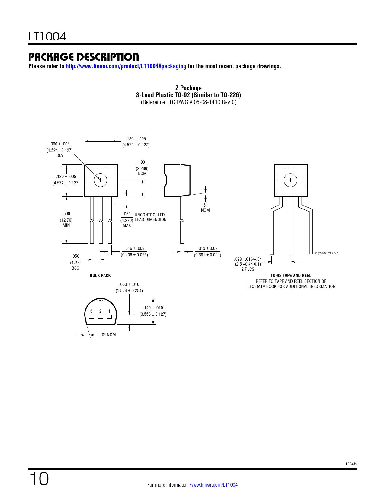 LT1004 package DescripTionPlease refer to http://www.linear.com/product/LT1004#packaging for the most recent package drawings.Z Package3-Lead Plastic TO-92 (Similar to TO-226) (Reference LTC DWG # 05-08-1410 Rev C) .180 ± .005 .060 ± .005 (4.572 ± 0.127) (1.524± 0.127) DIA .90 (2.286) NOM .180 ± .005 (4.572 ± 0.127) 5° NOM .500 .050 UNCONTROLLED (12.70) (1.270) LEAD DIMENSION MIN MAX .016 ± .003 .015 ± .002 Z3 (TO-92) 1008 REV C .050 (0.406 ± 0.076) (0.381 ± 0.051) .098 +.016/–.04 (1.27) (2.5 +0.4/–0.1) BSC 2 PLCS BULK PACKTO-92 TAPE AND REEL REFER TO TAPE AND REEL SECTION OF .060 ± .010 LTC DATA BOOK FOR ADDITIONAL INFORMATION (1.524 ± 0.254) .140 ± .010 3 2 1 (3.556 ± 0.127) 10° NOM 1004fc 10 For more information www.linear.com/LT1004