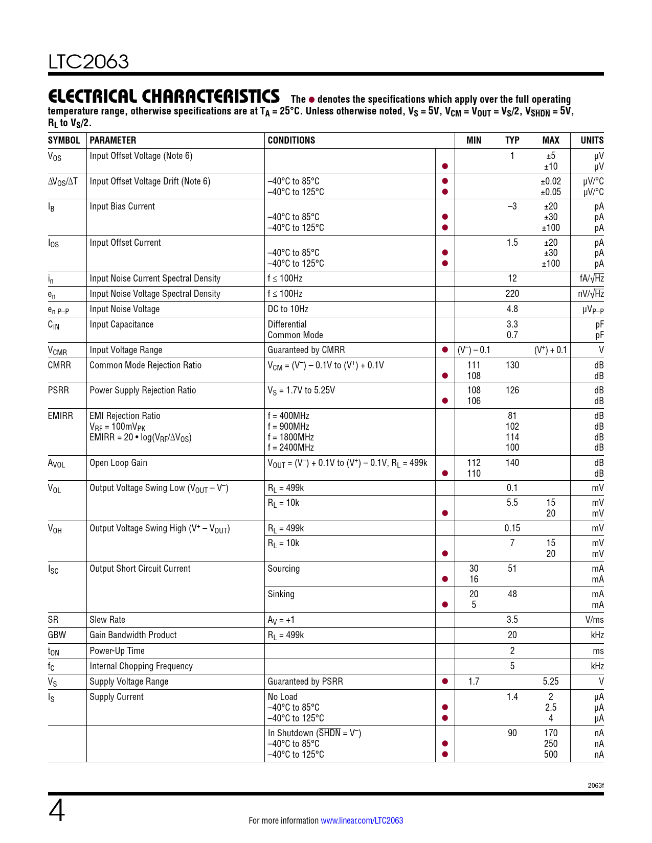 LTC2063 elecTrical characTerisTicsThe l denotes the specifications which apply over the full operatingtemperature range, otherwise specifications are at TA = 25°C. Unless otherwise noted, VS = 5V, VCM = VOUT = VS/2, VSHDN = 5V,RL to VS/2. SYMBOL PARAMETERCONDITIONSMINTYPMAXUNITS VOS Input Offset Voltage (Note 6) 1 ±5 μV l ±10 μV ΔVOS/ΔT Input Offset Voltage Drift (Note 6) –40°C to 85°C l ±0.02 μV/°C –40°C to 125°C l ±0.05 µV/°C IB Input Bias Current –3 ±20 pA –40°C to 85°C l ±30 pA –40°C to 125°C l ±100 pA IOS Input Offset Current 1.5 ±20 pA –40°C to 85°C l ±30 pA –40°C to 125°C l ±100 pA in Input Noise Current Spectral Density f ≤ 100Hz 12 fA/√Hz en Input Noise Voltage Spectral Density f ≤ 100Hz 220 nV/√Hz en P–P Input Noise Voltage DC to 10Hz 4.8 μVP–P CIN Input Capacitance Differential 3.3 pF Common Mode 0.7 pF VCMR Input Voltage Range Guaranteed by CMRR l (V–) – 0.1 (V+) + 0.1 V CMRR Common Mode Rejection Ratio VCM = (V–) – 0.1V to (V+) + 0.1V 111 130 dB l 108 dB PSRR Power Supply Rejection Ratio VS = 1.7V to 5.25V 108 126 dB l 106 dB EMIRR EMI Rejection Ratio f = 400MHz 81 dB VRF = 100mVPK f = 900MHz 102 dB EMIRR = 20 • log(VRF/ΔVOS) f = 1800MHz 114 dB f = 2400MHz 100 dB AVOL Open Loop Gain VOUT = (V–) + 0.1V to (V+) – 0.1V, RL = 499k 112 140 dB l 110 dB VOL Output Voltage Swing Low (VOUT – V–) RL = 499k 0.1 mV RL = 10k 5.5 15 mV l 20 mV VOH Output Voltage Swing High (V+ – VOUT) RL = 499k 0.15 mV RL = 10k 7 15 mV l 20 mV ISC Output Short Circuit Current Sourcing 30 51 mA l 16 mA Sinking 20 48 mA l 5 mA SR Slew Rate AV = +1 3.5 V/ms GBW Gain Bandwidth Product RL = 499k 20 kHz tON Power-Up Time 2 ms fC Internal Chopping Frequency 5 kHz VS Supply Voltage Range Guaranteed by PSRR l 1.7 5.25 V IS Supply Current No Load 1.4 2 μA –40°C to 85°C l 2.5 μA –40°C to 125°C l 4 µA In Shutdown (SHDN = V–) 90 170 nA –40°C to 85°C l 250 nA –40°C to 125°C l 500 nA 2063f 4 For more information www.linear.com/LTC2063 Document Outline Features Applications Typical Application Description Absolute Maximum Ratings Pin Configuration Order Information Electrical Characteristics Typical Performance Characteristics Pin Functions Block Diagram Typical Applications Typical Application Related Parts