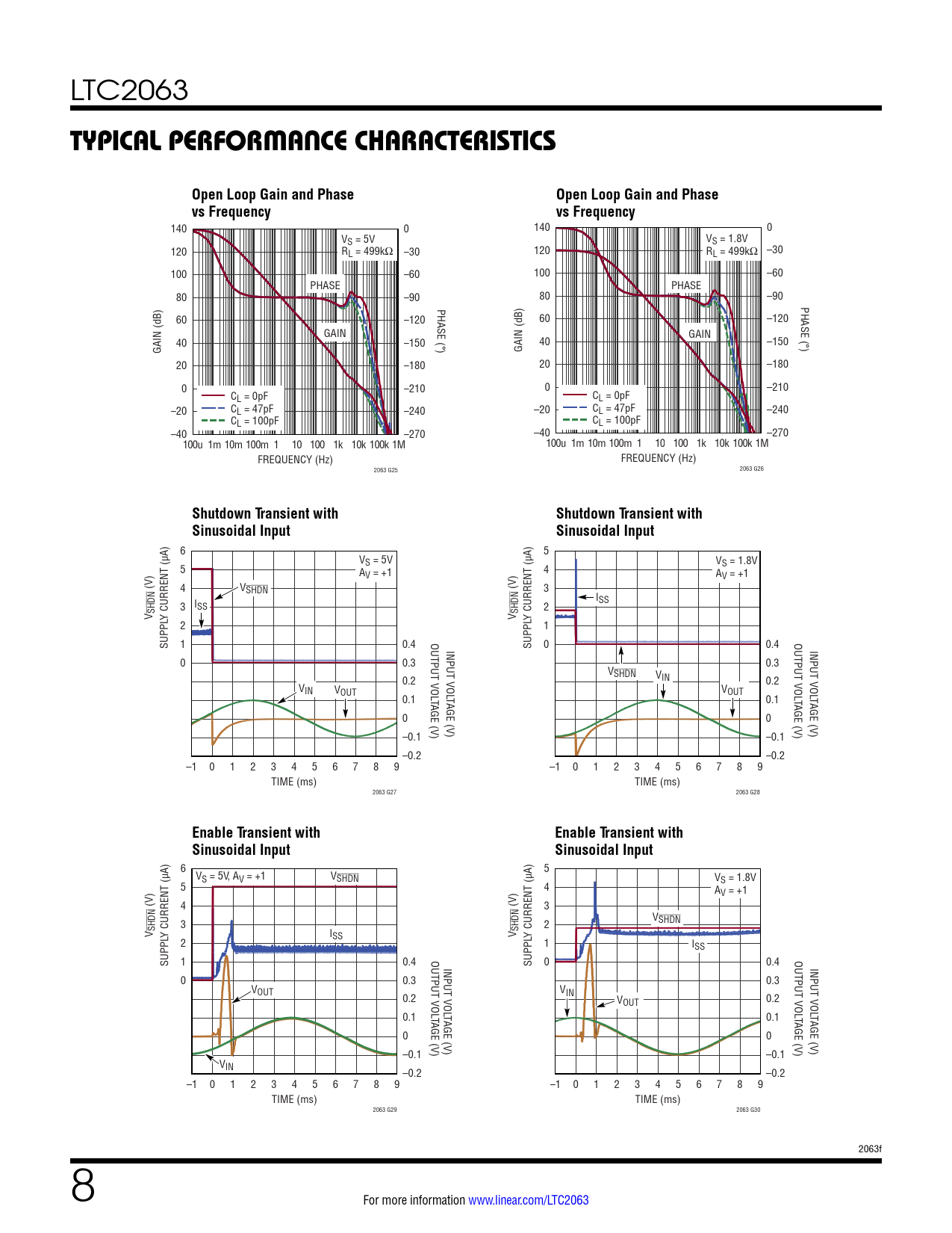 Typical perForMance characTerisTics. Open Loop Gain and Phase. vs Frequency. Shutdown Transient with. Sinusoidal Input