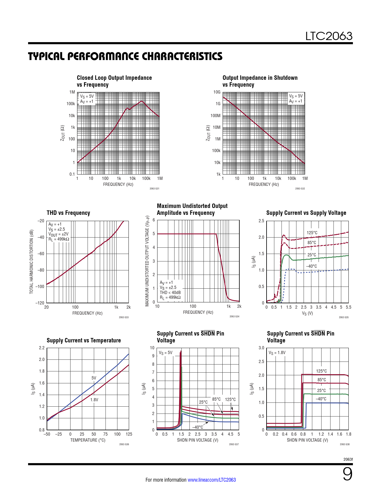 ) –20 6 2.5 A P–P V = +1 VS = ±2.5 V 5 125°C –40 OUT = ±2V TAGE (V R 2.0 L = 499kΩ 85°C TION (dB) 4 –60 1.5 25°C 3 (µA) TED OUTPUT VOL I S –40°C –80 1.0 2 A AL HARMONIC DISTOR V = +1 –100 1 VS = ±2.5 0.5 TOT THD < 40dB RL = 499kΩ –120 0 0 20 100 1k 2k MAXIMUM UNDISTOR 10 100 1k 2k 0 0.5 1 1.5 2 2.5 3 3.5 4 4.5 5 5.5 FREQUENCY (Hz) FREQUENCY (Hz) VS (V) 2063 G33 2063 G34 2063 G35