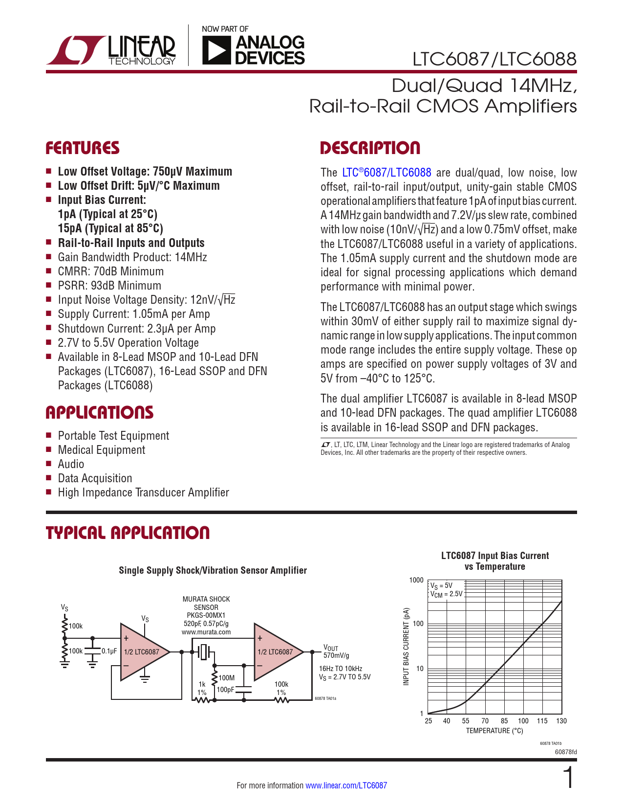 LTC6087/LTC6088 Dual/Quad 14MHz, Rail-to-Rail CMOS Amplifiers FEATURESDESCRIPTION n Low Offset Voltage: 750µV Maximum The LTC®6087/LTC6088 are dual/quad, low noise, low n Low Offset Drift: 5µV/°C Maximum offset, rail-to-rail input/output, unity-gain stable CMOS n Input Bias Current: operational amplifiers that feature 1pA of input bias current. 1pA (Typical at 25°C) A 14MHz gain bandwidth and 7.2V/µs slew rate, combined 15pA (Typical at 85°C) with low noise (10nV/√Hz) and a low 0.75mV offset, make n Rail-to-Rail Inputs and Outputs the LTC6087/LTC6088 useful in a variety of applications. n Gain Bandwidth Product: 14MHz The 1.05mA supply current and the shutdown mode are n CMRR: 70dB Minimum ideal for signal processing applications which demand n PSRR: 93dB Minimum performance with minimal power. n Input Noise Voltage Density: 12nV/√Hz The LTC6087/LTC6088 has an output stage which swings n Supply Current: 1.05mA per Amp within 30mV of either supply rail to maximize signal dy- n Shutdown Current: 2.3µA per Amp namic range in low supply applications. The input common n 2.7V to 5.5V Operation Voltage mode range includes the entire supply voltage. These op n Available in 8-Lead MSOP and 10-Lead DFN amps are specified on power supply voltages of 3V and Packages (LTC6087), 16-Lead SSOP and DFN 5V from –40°C to 125°C. Packages (LTC6088) The dual amplifier LTC6087 is available in 8-lead MSOP APPLICATIONS and 10-lead DFN packages. The quad amplifier LTC6088 is available in 16-lead SSOP and DFN packages. n Portable Test Equipment L, LT, LTC, LTM, Linear Technology and the Linear logo are registered trademarks of Analog n Medical Equipment Devices, Inc. All other trademarks are the property of their respective owners. n Audio n Data Acquisition n High Impedance Transducer Amplifier TYPICAL APPLICATIONLTC6087 Input Bias CurrentSingle Supply Shock/Vibration Sensor Amplifiervs Temperature 1000 VS = 5V V MURATA SHOCK CM = 2.5V VS SENSOR PKGS-00MX1 VS 520pF, 0.57pC/g 100k 100 + www.murata.com + V 100k 0.1µF 1/2 LTC6087 1/2 LTC6087 OUT 570mV/g – – 16Hz TO 10kHz 10 100M VS = 2.7V TO 5.5V 1k 100k INPUT BIAS CURRENT (pA) 1% 100pF 1% 60878 TA01a 1 25 40 55 70 85 100 115 130 TEMPERATURE (°C) 60878 TA01b 60878fd For more information www.linear.com/LTC6087 1 Document Outline Features Applications Description Typical Application Absolute Maximum Ratings Pin Configuration Order Information Electrical Characteristics Typical Performance Characteristics Pin Functions Applications Information Simplified Schematic Package Description Revision History Typical Applications Related Parts
