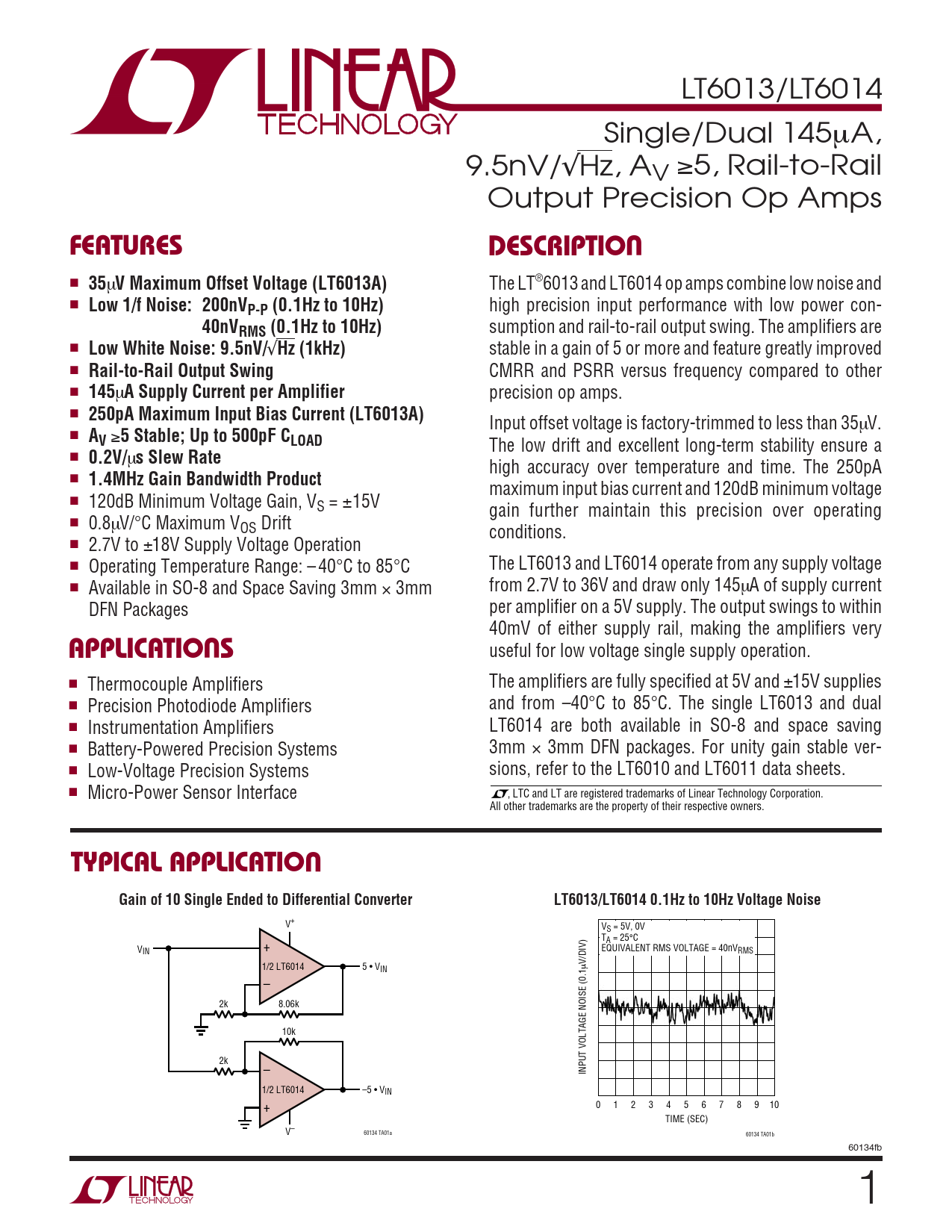 LT6013/LT6014 Single/Dual 145µA, 9.5nV/√Hz, AV ≥5, Rail-to-Rail Output Precision Op Amps UFEATURESDESCRIPTIO ■ 35 µ V Maximum Offset Voltage (LT6013A) The LT®6013 and LT6014 op amps combine low noise and ■ Low 1/f Noise: 200nVP-P (0.1Hz to 10Hz) high precision input performance with low power con- 40nVRMS (0.1Hz to 10Hz) sumption and rail-to-rail output swing. The amplifiers are ■ Low White Noise: 9.5nV/ √ Hz (1kHz) stable in a gain of 5 or more and feature greatly improved ■ Rail-to-Rail Output Swing CMRR and PSRR versus frequency compared to other ■ 145 µ A Supply Current per Amplifier precision op amps. ■ 250pA Maximum Input Bias Current (LT6013A) Input offset voltage is factory-trimmed to less than 35µV. ■ AV ≥ 5 Stable; Up to 500pF CLOAD The low drift and excellent long-term stability ensure a ■ 0.2V/ µ s Slew Rate high accuracy over temperature and time. The 250pA ■ 1.4MHz Gain Bandwidth Product maximum input bias current and 120dB minimum voltage ■ 120dB Minimum Voltage Gain, VS = ±15V gain further maintain this precision over operating ■ 0.8µV/°C Maximum VOS Drift conditions. ■ 2.7V to ±18V Supply Voltage Operation ■ Operating Temperature Range: – 40°C to 85°C The LT6013 and LT6014 operate from any supply voltage ■ Available in SO-8 and Space Saving 3mm × 3mm from 2.7V to 36V and draw only 145µA of supply current DFN Packages per amplifier on a 5V supply. The output swings to within U 40mV of either supply rail, making the amplifiers very APPLICATIO S useful for low voltage single supply operation. ■ Thermocouple Amplifiers The amplifiers are fully specified at 5V and ±15V supplies ■ Precision Photodiode Amplifiers and from –40°C to 85°C. The single LT6013 and dual ■ Instrumentation Amplifiers LT6014 are both available in SO-8 and space saving ■ Battery-Powered Precision Systems 3mm × 3mm DFN packages. For unity gain stable ver- ■ Low-Voltage Precision Systems sions, refer to the LT6010 and LT6011 data sheets. ■ Micro-Power Sensor Interface , LTC and LT are registered trademarks of Linear Technology Corporation. All other trademarks are the property of their respective owners. UTYPICAL APPLICATIOGain of 10 Single Ended to Differential ConverterLT6013/LT6014 0.1Hz to 10Hz Voltage Noise V+ VS = 5V, 0V TA = 25°C V + IN EQUIVALENT RMS VOLTAGE = 40nVRMS V/DIV) 1/2 LT6014 5 • VIN µ – 2k 8.06k 10k 2k – INPUT VOLTAGE NOISE (0.1 1/2 LT6014 –5 • VIN + 0 1 2 3 4 5 6 7 8 9 10 TIME (SEC) V– 60134 TA01a 60134 TA01b 60134fb 1