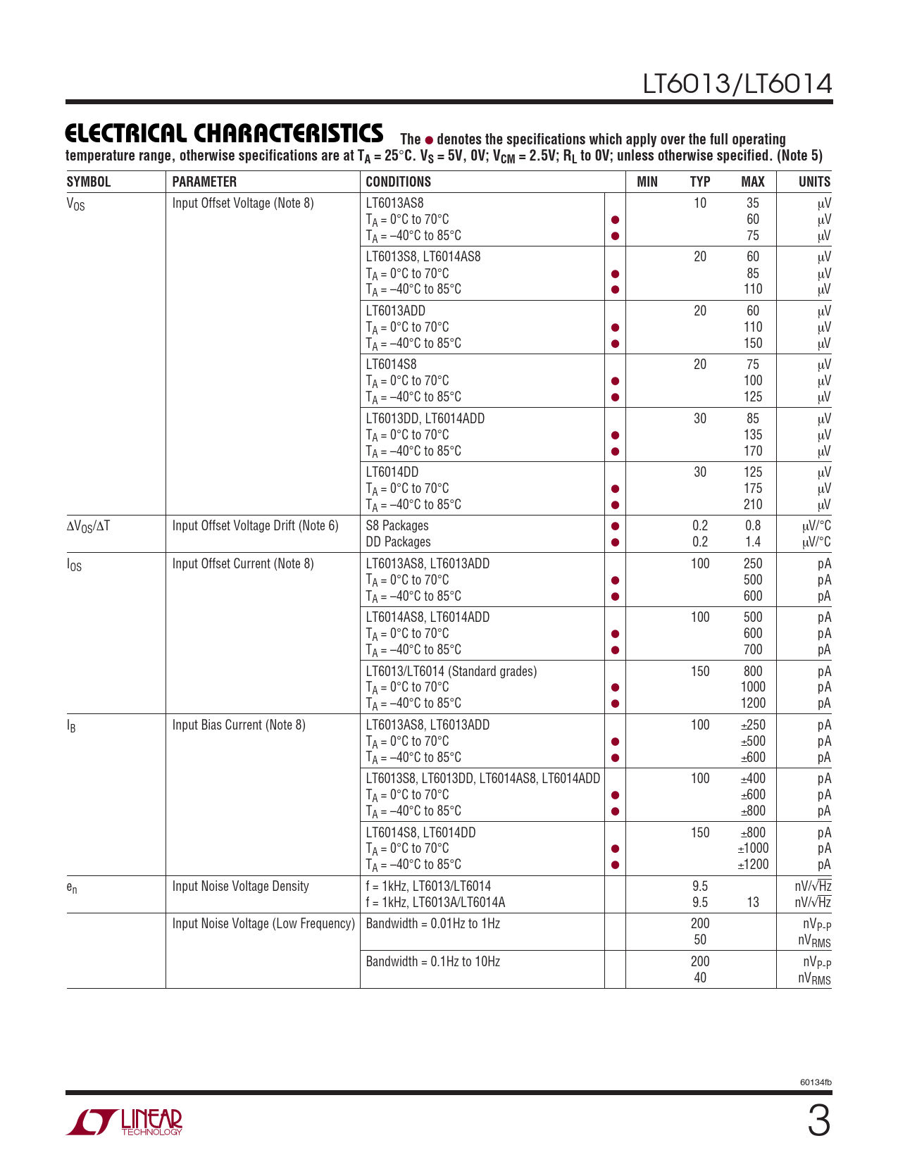 LT6013/LT6014 ELECTRICAL CHARACTERISTICS The ● denotes the specifications which apply over the full operatingtemperature range, otherwise specifications are at TA = 25 ° C. VS = 5V, 0V; VCM = 2.5V; RL to 0V; unless otherwise specified. (Note 5)SYMBOLPARAMETERCONDITIONSMINTYPMAXUNITS VOS Input Offset Voltage (Note 8) LT6013AS8 10 35 µV TA = 0°C to 70°C ● 60 µV TA = –40°C to 85°C ● 75 µV LT6013S8, LT6014AS8 20 60 µV TA = 0°C to 70°C ● 85 µV TA = –40°C to 85°C ● 110 µV LT6013ADD 20 60 µV TA = 0°C to 70°C ● 110 µV TA = –40°C to 85°C ● 150 µV LT6014S8 20 75 µV TA = 0°C to 70°C ● 100 µV TA = –40°C to 85°C ● 125 µV LT6013DD, LT6014ADD 30 85 µV TA = 0°C to 70°C ● 135 µV TA = –40°C to 85°C ● 170 µV LT6014DD 30 125 µV TA = 0°C to 70°C ● 175 µV TA = –40°C to 85°C ● 210 µV ∆VOS/∆T Input Offset Voltage Drift (Note 6) S8 Packages ● 0.2 0.8 µV/°C DD Packages ● 0.2 1.4 µV/°C IOS Input Offset Current (Note 8) LT6013AS8, LT6013ADD 100 250 pA TA = 0°C to 70°C ● 500 pA TA = –40°C to 85°C ● 600 pA LT6014AS8, LT6014ADD 100 500 pA TA = 0°C to 70°C ● 600 pA TA = –40°C to 85°C ● 700 pA LT6013/LT6014 (Standard grades) 150 800 pA TA = 0°C to 70°C ● 1000 pA TA = –40°C to 85°C ● 1200 pA IB Input Bias Current (Note 8) LT6013AS8, LT6013ADD 100 ±250 pA TA = 0°C to 70°C ● ±500 pA TA = –40°C to 85°C ● ±600 pA LT6013S8, LT6013DD, LT6014AS8, LT6014ADD 100 ±400 pA TA = 0°C to 70°C ● ±600 pA TA = –40°C to 85°C ● ±800 pA LT6014S8, LT6014DD 150 ±800 pA TA = 0°C to 70°C ● ±1000 pA TA = –40°C to 85°C ● ±1200 pA en Input Noise Voltage Density f = 1kHz, LT6013/LT6014 9.5 nV/√Hz f = 1kHz, LT6013A/LT6014A 9.5 13 nV/√Hz Input Noise Voltage (Low Frequency) Bandwidth = 0.01Hz to 1Hz 200 nVP-P 50 nVRMS Bandwidth = 0.1Hz to 10Hz 200 nVP-P 40 nVRMS 60134fb 3