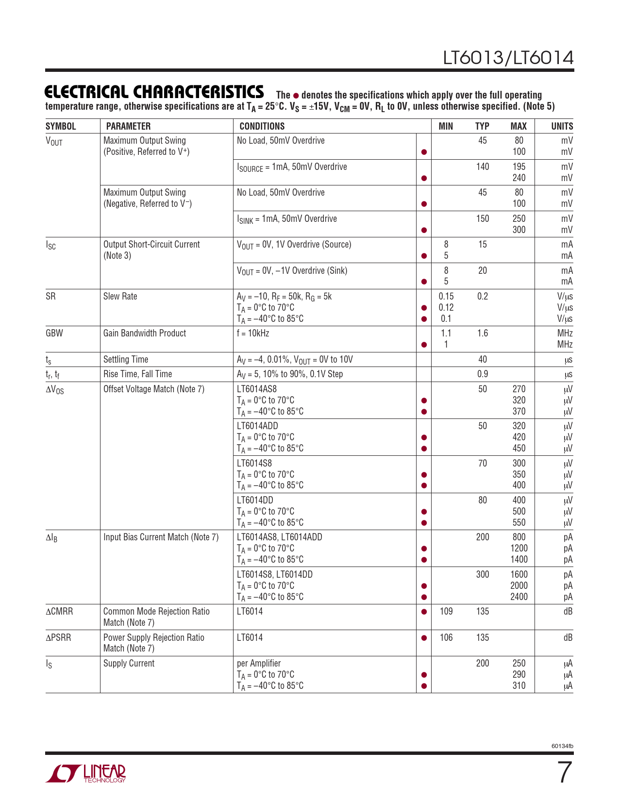 VOUT Maximum Output Swing No Load, 50mV Overdrive 45 80 mV (Positive, Referred to V+) ● 100 mV ISOURCE = 1mA, 50mV Overdrive 140 195 mV ● 240 mV Maximum Output Swing No Load, 50mV Overdrive 45 80 mV (Negative, Referred to V–) ● 100 mV ISINK = 1mA, 50mV Overdrive 150 250 mV ● 300 mV ISC Output Short-Circuit Current VOUT = 0V, 1V Overdrive (Source) 8 15 mA (Note 3) ● 5 mA VOUT = 0V, –1V Overdrive (Sink) 8 20 mA ● 5 mA SR Slew Rate AV = –10, RF = 50k, RG = 5k 0.15 0.2 V/µs TA = 0°C to 70°C ● 0.12 V/µs TA = –40°C to 85°C ● 0.1 V/µs GBW Gain Bandwidth Product f = 10kHz 1.1 1.6 MHz ● 1 MHz ts Settling Time AV = –4, 0.01%, VOUT = 0V to 10V 40 µs tr, tf Rise Time, Fall Time AV = 5, 10% to 90%, 0.1V Step 0.9 µs ∆VOS Offset Voltage Match (Note 7) LT6014AS8 50 270 µV TA = 0°C to 70°C ● 320 µV TA = –40°C to 85°C ● 370 µV LT6014ADD 50 320 µV TA = 0°C to 70°C ● 420 µV TA = –40°C to 85°C ● 450 µV LT6014S8 70 300 µV TA = 0°C to 70°C ● 350 µV TA = –40°C to 85°C ● 400 µV LT6014DD 80 400 µV TA = 0°C to 70°C ● 500 µV TA = –40°C to 85°C ● 550 µV ∆IB Input Bias Current Match (Note 7) LT6014AS8, LT6014ADD 200 800 pA TA = 0°C to 70°C ● 1200 pA TA = –40°C to 85°C ● 1400 pA LT6014S8, LT6014DD 300 1600 pA TA = 0°C to 70°C ● 2000 pA TA = –40°C to 85°C ● 2400 pA ∆CMRR Common Mode Rejection Ratio LT6014 ● 109 135 dB Match (Note 7) ∆PSRR Power Supply Rejection Ratio LT6014 ● 106 135 dB Match (Note 7) IS Supply Current per Amplifier 200 250 µA TA = 0°C to 70°C ● 290 µA TA = –40°C to 85°C ● 310 µA 60134fb 7