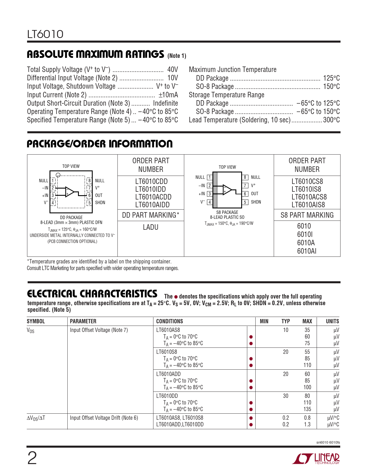 VOS Input Offset Voltage (Note 7) LT6010AS8 10 35 µV TA = 0°C to 70°C ● 60 µV TA = –40°C to 85°C ● 75 µV LT6010S8 20 55 µV TA = 0°C to 70°C ● 85 µV TA = –40°C to 85°C ● 110 µV LT6010ADD 20 60 µV TA = 0°C to 70°C ● 85 µV TA = –40°C to 85°C ● 100 µV LT6010DD 30 80 µV TA = 0°C to 70°C ● 110 µV TA = –40°C to 85°C ● 135 µV ∆VOS/∆T Input Offset Voltage Drift (Note 6) LT6010AS8, LT6010S8 ● 0.2 0.8 µV/°C LT6010ADD,LT6010DD ● 0.2 1.3 µV/°C sn6010 6010fs 2