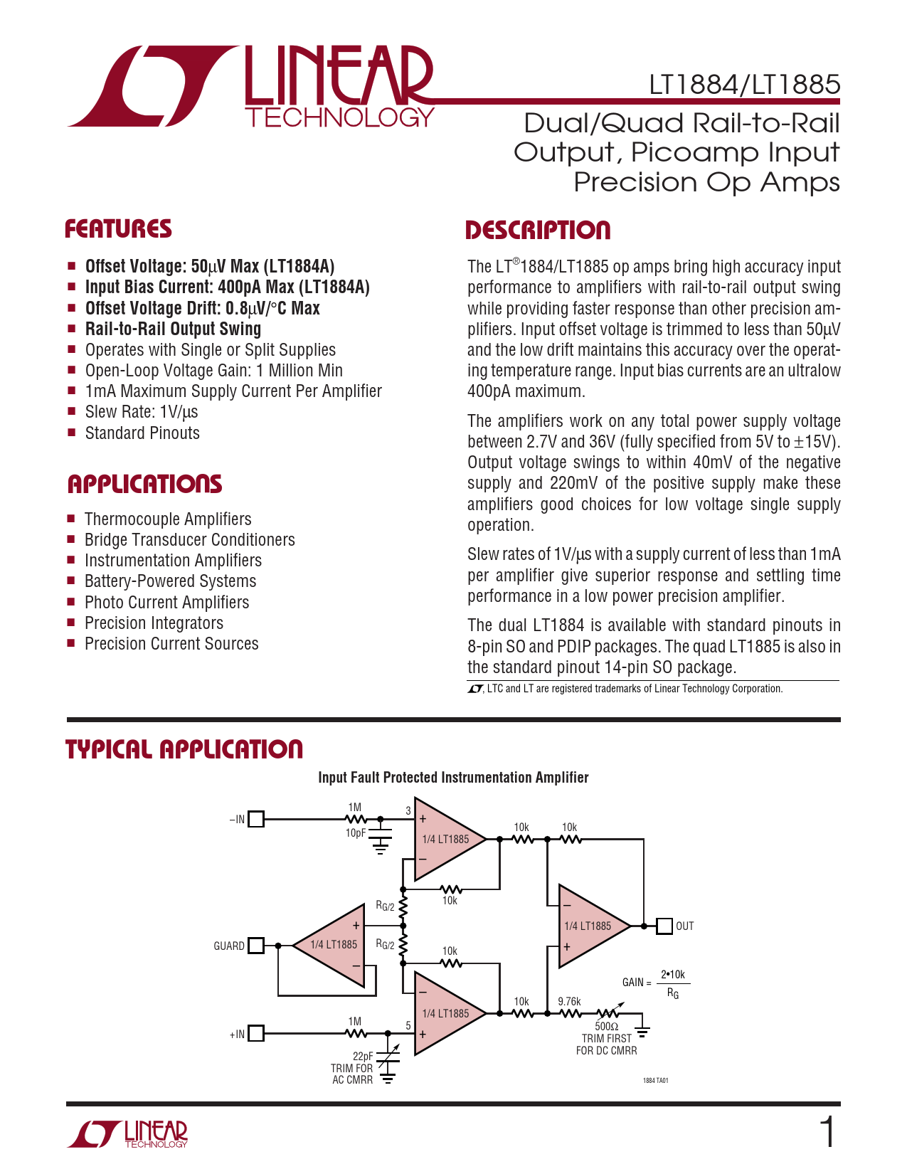 LT1884/LT1885 Dual/Quad Rail-to-Rail Output, Picoamp Input Precision Op Amps UFEATURESDESCRIPTIO ■ Offset Voltage: 50 µ V Max (LT1884A) The LT®1884/LT1885 op amps bring high accuracy input ■ Input Bias Current: 400pA Max (LT1884A) performance to amplifiers with rail-to-rail output swing ■ Offset Voltage Drift: 0.8 µ V/ ° C Max while providing faster response than other precision am- ■ Rail-to-Rail Output Swing plifiers. Input offset voltage is trimmed to less than 50µV ■ Operates with Single or Split Supplies and the low drift maintains this accuracy over the operat- ■ Open-Loop Voltage Gain: 1 Million Min ing temperature range. Input bias currents are an ultralow ■ 1mA Maximum Supply Current Per Amplifier 400pA maximum. ■ Slew Rate: 1V/µs The amplifiers work on any total power supply voltage ■ Standard Pinouts between 2.7V and 36V (fully specified from 5V to ±15V). Output voltage swings to within 40mV of the negative U supply and 220mV of the positive supply make these APPLICATIO S amplifiers good choices for low voltage single supply ■ Thermocouple Amplifiers operation. ■ Bridge Transducer Conditioners ■ Slew rates of 1V/µs with a supply current of less than 1mA Instrumentation Amplifiers ■ per amplifier give superior response and settling time Battery-Powered Systems ■ performance in a low power precision amplifier. Photo Current Amplifiers ■ Precision Integrators The dual LT1884 is available with standard pinouts in ■ Precision Current Sources 8-pin SO and PDIP packages. The quad LT1885 is also in the standard pinout 14-pin SO package. , LTC and LT are registered trademarks of Linear Technology Corporation. UTYPICAL APPLICATIOInput Fault Protected Instrumentation Amplifier 1M 3 –IN + 10k 10k 10pF 1/4 LT1885 – R 10k G/2 – + 1/4 LT1885 OUT 1/4 LT1885 R GUARD G/2 + 10k – 2•10k GAIN = – RG 10k 9.76k 1/4 LT1885 1M 5 500Ω +IN + TRIM FIRST FOR DC CMRR 22pF TRIM FOR AC CMRR 1884 TA01 1