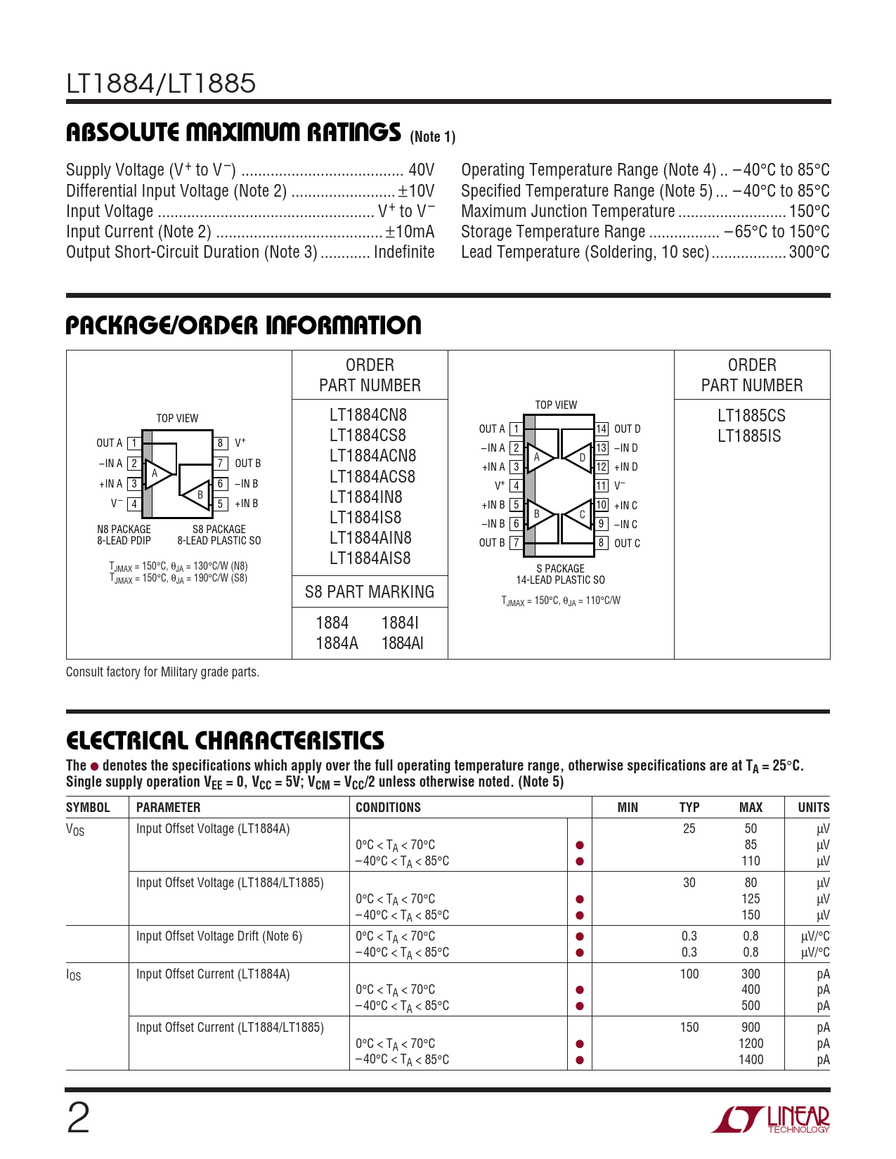 LT1884/LT1885 WWWUABSOLUTE AXI U RATI GS (Note 1) Supply Voltage (V+ to V –) ... 40V Operating Temperature Range (Note 4) .. – 40°C to 85°C Differential Input Voltage (Note 2) ... ±10V Specified Temperature Range (Note 5) ... – 40°C to 85°C Input Voltage .. V+ to V – Maximum Junction Temperature .. 150°C Input Current (Note 2) .. ±10mA Storage Temperature Range ... – 65°C to 150°C Output Short-Circuit Duration (Note 3) .. Indefinite Lead Temperature (Soldering, 10 sec).. 300°C UWUPACKAGE/ORDER I FOR ATIO ORDER ORDER PART NUMBER PART NUMBER TOP VIEW TOP VIEW LT1884CN8 LT1885CS LT1884CS8 OUT A 1 14 OUT D LT1885IS OUT A 1 8 V+ LT1884ACN8 – IN A 2 13 –IN D A D –IN A 2 7 OUT B +IN A 3 12 +IN D A LT1884ACS8 +IN A 3 6 –IN B V+ 4 11 V– B LT1884IN8 V – 4 5 +IN B +IN B 5 10 +IN C LT1884IS8 B C –IN B 6 9 –IN C N8 PACKAGE S8 PACKAGE 8-LEAD PDIP 8-LEAD PLASTIC SO LT1884AIN8 OUT B 7 8 OUT C LT1884AIS8 TJMAX = 150°C, θJA = 130°C/W (N8) S PACKAGE TJMAX = 150°C, θJA = 190°C/W (S8) 14-LEAD PLASTIC SO S8 PART MARKING TJMAX = 150°C, θJA = 110°C/W 1884 1884I 1884A 1884AI Consult factory for Military grade parts. ELECTRICAL CHARACTERISTICS The ● denotes the specifications which apply over the full operating temperature range, otherwise specifications are at TA = 25 ° C.Single supply operation VEE = 0, VCC = 5V; VCM = VCC/2 unless otherwise noted. (Note 5)SYMBOLPARAMETERCONDITIONSMINTYPMAXUNITS VOS Input Offset Voltage (LT1884A) 25 50 µV 0°C < TA < 70°C ● 85 µV – 40°C < TA < 85°C ● 110 µV Input Offset Voltage (LT1884/LT1885) 30 80 µV 0°C < TA < 70°C ● 125 µV – 40°C < TA < 85°C ● 150 µV Input Offset Voltage Drift (Note 6) 0°C < TA < 70°C ● 0.3 0.8 µV/°C – 40°C < TA < 85°C ● 0.3 0.8 µV/°C IOS Input Offset Current (LT1884A) 100 300 pA 0°C < TA < 70°C ● 400 pA – 40°C < TA < 85°C ● 500 pA Input Offset Current (LT1884/LT1885) 150 900 pA 0°C < TA < 70°C ● 1200 pA – 40°C < TA < 85°C ● 1400 pA 2