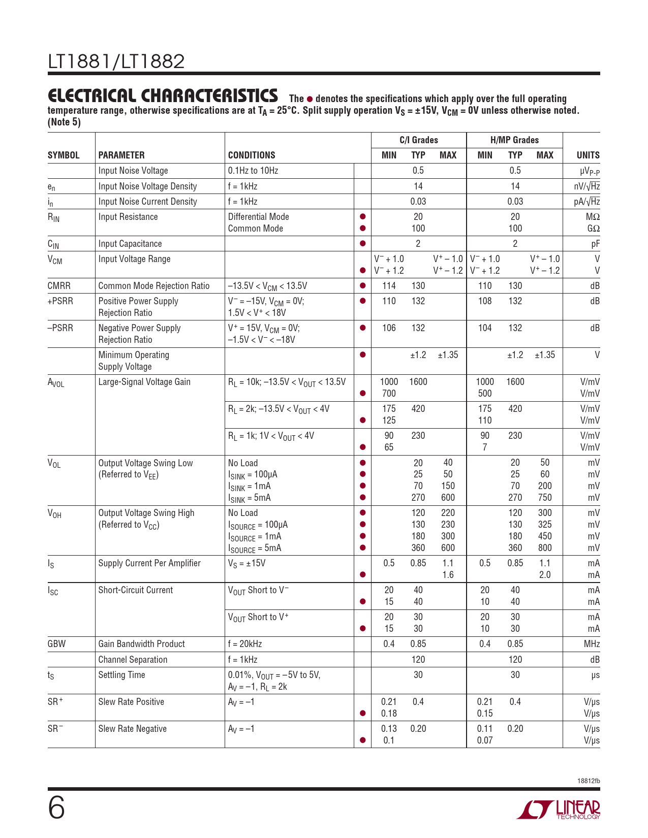 LT1881/LT1882 ELECTRICAL CHARACTERISTICSThe l denotes the specifi cations which apply over the full operatingtemperature range, otherwise specifi cations are at TA = 25°C. Split supply operation VS = ±15V, VCM = 0V unless otherwise noted.(Note 5)C/I GradesH/MP GradesSYMBOLPARAMETERCONDITIONSMINTYPMAXMINTYPMAXUNITS Input Noise Voltage 0.1Hz to 10Hz 0.5 0.5 μVP-P en Input Noise Voltage Density f = 1kHz 14 14 nV/√Hz in Input Noise Current Density f = 1kHz 0.03 0.03 pA/√Hz RIN Input Resistance Differential Mode l 20 20 MΩ Common Mode l 100 100 GΩ CIN Input Capacitance l 2 2 pF VCM Input Voltage Range V– + 1.0 V+ – 1.0 V– + 1.0 V+ – 1.0 V l V– + 1.2 V+ – 1.2 V– + 1.2 V+ – 1.2 V CMRR Common Mode Rejection Ratio –13.5V < VCM < 13.5V l 114 130 110 130 dB +PSRR Positive Power Supply V– = –15V, VCM = 0V; l 110 132 108 132 dB Rejection Ratio 1.5V < V+ < 18V –PSRR Negative Power Supply V+ = 15V, VCM = 0V; l 106 132 104 132 dB Rejection Ratio –1.5V < V– < –18V Minimum Operating l ±1.2 ±1.35 ±1.2 ±1.35 V Supply Voltage AVOL Large-Signal Voltage Gain RL = 10k; –13.5V < VOUT < 13.5V 1000 1600 1000 1600 V/mV l 700 500 V/mV RL = 2k; –13.5V < VOUT < 4V 175 420 175 420 V/mV l 125 110 V/mV RL = 1k; 1V < VOUT < 4V 90 230 90 230 V/mV l 65 7 V/mV VOL Output Voltage Swing Low No Load l 20 40 20 50 mV (Referred to VEE) ISINK = 100μA l 25 50 25 60 mV ISINK = 1mA l 70 150 70 200 mV ISINK = 5mA l 270 600 270 750 mV VOH Output Voltage Swing High No Load l 120 220 120 300 mV (Referred to VCC) ISOURCE = 100μA l 130 230 130 325 mV ISOURCE = 1mA l 180 300 180 450 mV ISOURCE = 5mA l 360 600 360 800 mV IS Supply Current Per Amplifi er VS = ±15V 0.5 0.85 1.1 0.5 0.85 1.1 mA l 1.6 2.0 mA ISC Short-Circuit Current VOUT Short to V– 20 40 20 40 mA l 15 40 10 40 mA VOUT Short to V+ 20 30 20 30 mA l 15 30 10 30 mA GBW Gain Bandwidth Product f = 20kHz 0.4 0.85 0.4 0.85 MHz Channel Separation f = 1kHz 120 120 dB tS Settling Time 0.01%, VOUT = – 5V to 5V, 30 30 μs AV = –1, RL = 2k SR + Slew Rate Positive AV = –1 0.21 0.4 0.21 0.4 V/μs l 0.18 0.15 V/μs SR – Slew Rate Negative AV = –1 0.13 0.20 0.11 0.20 V/μs l 0.1 0.07 V/μs 18812fb 6