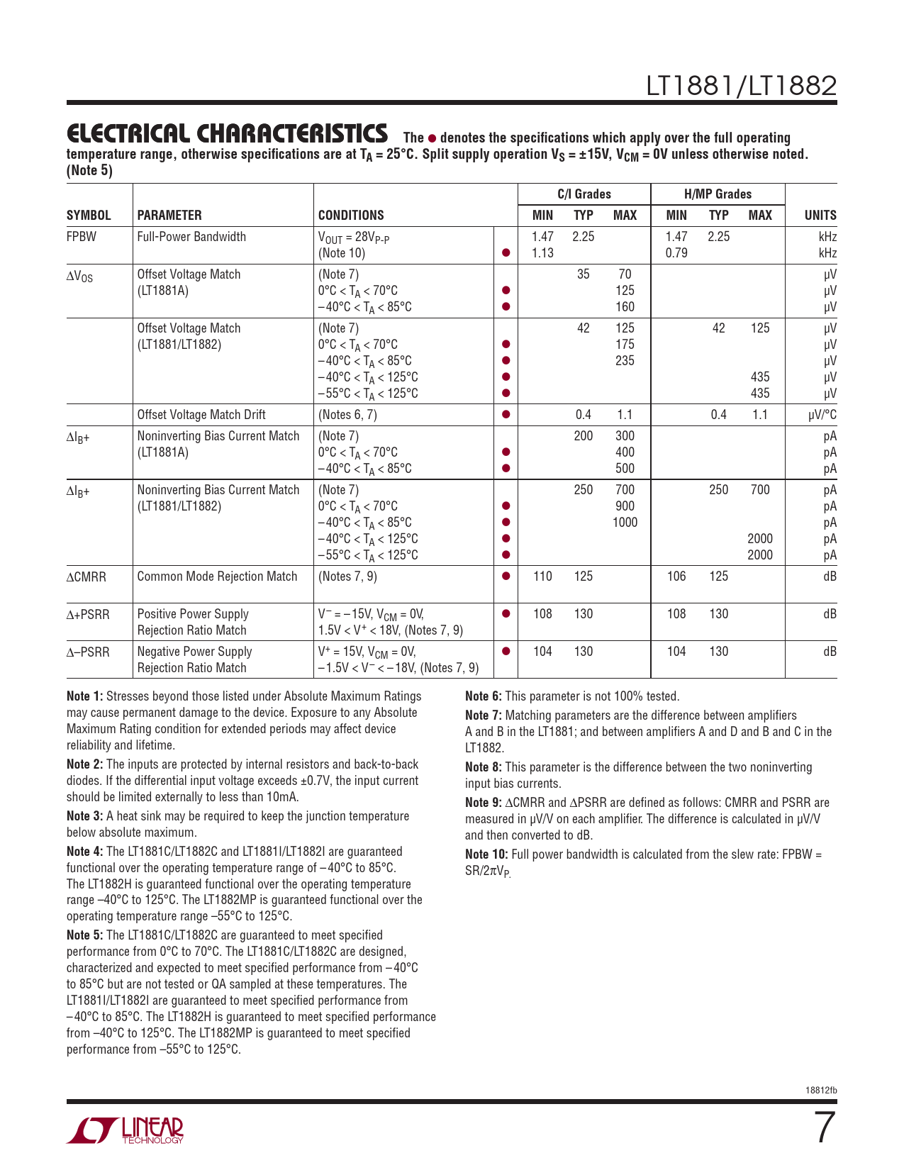 LT1881/LT1882 ELECTRICAL CHARACTERISTICSThe l denotes the specifi cations which apply over the full operatingtemperature range, otherwise specifi cations are at TA = 25°C. Split supply operation VS = ±15V, VCM = 0V unless otherwise noted.(Note 5)C/I GradesH/MP GradesSYMBOLPARAMETERCONDITIONSMINTYPMAXMINTYPMAXUNITS FPBW Full-Power Bandwidth VOUT = 28VP-P 1.47 2.25 1.47 2.25 kHz (Note 10) l 1.13 0.79 kHz ΔVOS Offset Voltage Match (Note 7) 35 70 μV (LT1881A) 0°C < TA < 70°C l 125 μV – 40°C < TA < 85°C l 160 μV Offset Voltage Match (Note 7) 42 125 42 125 μV (LT1881/LT1882) 0°C < TA < 70°C l 175 μV – 40°C < TA < 85°C l 235 μV – 40°C < TA < 125°C l 435 μV – 55°C < TA < 125°C l 435 μV Offset Voltage Match Drift (Notes 6, 7) l 0.4 1.1 0.4 1.1 μV/°C ΔIB+ Noninverting Bias Current Match (Note 7) 200 300 pA (LT1881A) 0°C < TA < 70°C l 400 pA – 40°C < TA < 85°C l 500 pA ΔIB+ Noninverting Bias Current Match (Note 7) 250 700 250 700 pA (LT1881/LT1882) 0°C < TA < 70°C l 900 pA – 40°C < TA < 85°C l 1000 pA – 40°C < TA < 125°C l 2000 pA – 55°C < TA < 125°C l 2000 pA ΔCMRR Common Mode Rejection Match (Notes 7, 9) l 110 125 106 125 dB Δ+PSRR Positive Power Supply V– = – 15V, VCM = 0V, l 108 130 108 130 dB Rejection Ratio Match 1.5V < V+ < 18V, (Notes 7, 9) Δ–PSRR Negative Power Supply V+ = 15V, VCM = 0V, l 104 130 104 130 dB Rejection Ratio Match – 1.5V < V– < – 18V, (Notes 7, 9) Note 1: Stresses beyond those listed under Absolute Maximum Ratings Note 6: This parameter is not 100% tested. may cause permanent damage to the device. Exposure to any Absolute Note 7: Matching parameters are the difference between amplifi ers Maximum Rating condition for extended periods may affect device A and B in the LT1881; and between amplifi ers A and D and B and C in the reliability and lifetime. LT1882. Note 2: The inputs are protected by internal resistors and back-to-back Note 8: This parameter is the difference between the two noninverting diodes. If the differential input voltage exceeds ±0.7V, the input current input bias currents. should be limited externally to less than 10mA. Note 9: ΔCMRR and ΔPSRR are defi ned as follows: CMRR and PSRR are Note 3: A heat sink may be required to keep the junction temperature measured in μV/V on each amplifi er. The difference is calculated in μV/V below absolute maximum. and then converted to dB. Note 4: The LT1881C/LT1882C and LT1881I/LT1882I are guaranteed Note 10: Full power bandwidth is calculated from the slew rate: FPBW = functional over the operating temperature range of – 40°C to 85°C. SR/2πVP. The LT1882H is guaranteed functional over the operating temperature range –40°C to 125°C. The LT1882MP is guaranteed functional over the operating temperature range –55°C to 125°C. Note 5: The LT1881C/LT1882C are guaranteed to meet specifi ed performance from 0°C to 70°C. The LT1881C/LT1882C are designed, characterized and expected to meet specifi ed performance from – 40°C to 85°C but are not tested or QA sampled at these temperatures. The LT1881I/LT1882I are guaranteed to meet specifi ed performance from – 40°C to 85°C. The LT1882H is guaranteed to meet specifi ed performance from –40°C to 125°C. The LT1882MP is guaranteed to meet specifi ed performance from –55°C to 125°C. 18812fb 7
