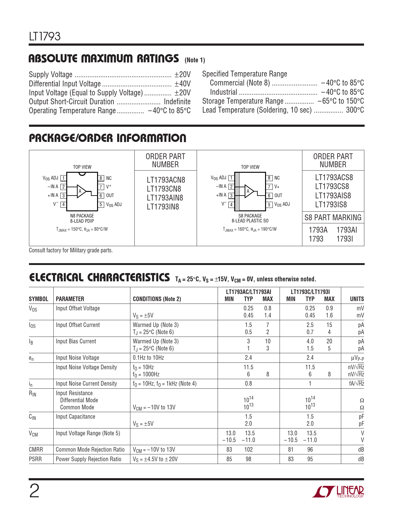 15V, VCM = 0V, unless otherwise noted. LT1793AC/LT1793AI LT1793C/LT1793I SYMBOL PARAMETER CONDITIONS (Note 2) MIN TYP MAX MIN TYP MAX UNITS