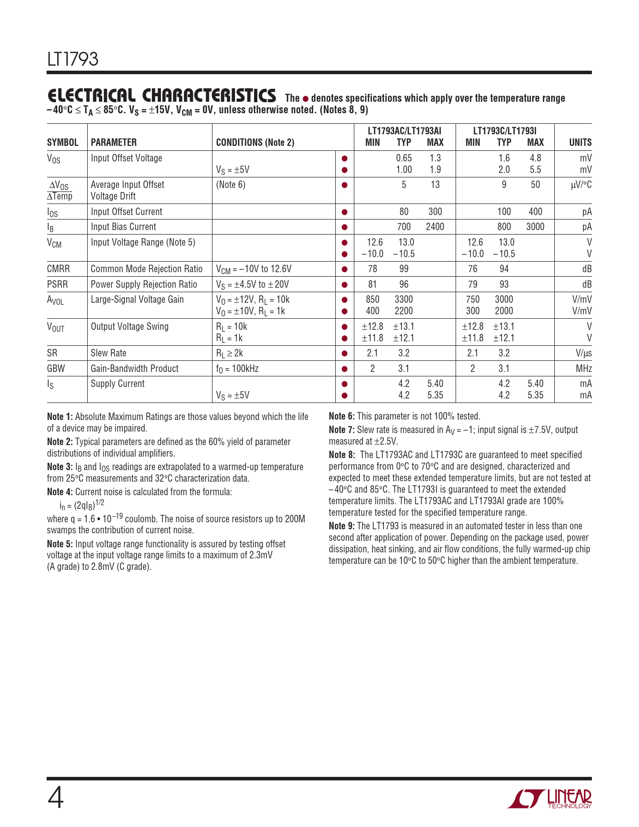 LT1793 ELECTRICAL CHCARA TERISTICS The ● denotes specifications which apply over the temperature range– 40 ° C ≤ TA ≤ 85 ° C. VS = ± 15V, VCM = 0V, unless otherwise noted. (Notes 8, 9)LT1793AC/LT1793AILT1793C/LT1793ISYMBOLPARAMETERCONDITIONS (Note 2)MINTYPMAXMINTYPMAXUNITS VOS Input Offset Voltage ● 0.65 1.3 1.6 4.8 mV VS = ±5V ● 1.00 1.9 2.0 5.5 mV ∆VOS Average Input Offset (Note 6) ● 5 13 9 50 µV/°C ∆Temp Voltage Drift IOS Input Offset Current ● 80 300 100 400 pA IB Input Bias Current ● 700 2400 800 3000 pA VCM Input Voltage Range (Note 5) ● 12.6 13.0 12.6 13.0 V ● – 10.0 – 10.5 – 10.0 – 10.5 V CMRR Common Mode Rejection Ratio VCM = –10V to 12.6V ● 78 99 76 94 dB PSRR Power Supply Rejection Ratio VS = ±4.5V to ± 20V ● 81 96 79 93 dB AVOL Large-Signal Voltage Gain VO = ±12V, RL = 10k ● 850 3300 750 3000 V/mV VO = ±10V, RL = 1k ● 400 2200 300 2000 V/mV VOUT Output Voltage Swing RL = 10k ● ±12.8 ±13.1 ±12.8 ±13.1 V RL = 1k ● ±11.8 ±12.1 ±11.8 ±12.1 V SR Slew Rate RL ≥ 2k ● 2.1 3.2 2.1 3.2 V/µs GBW Gain-Bandwidth Product fO = 100kHz ● 2 3.1 2 3.1 MHz IS Supply Current ● 4.2 5.40 4.2 5.40 mA VS = ±5V ● 4.2 5.35 4.2 5.35 mA Note 1: Absolute Maximum Ratings are those values beyond which the life Note 6: This parameter is not 100% tested. of a device may be impaired. Note 7: Slew rate is measured in AV = –1; input signal is ±7.5V, output Note 2: Typical parameters are defined as the 60% yield of parameter measured at ±2.5V. distributions of individual amplifiers. Note 8: The LT1793AC and LT1793C are guaranteed to meet specified Note 3: IB and IOS readings are extrapolated to a warmed-up temperature performance from 0°C to 70°C and are designed, characterized and from 25°C measurements and 32°C characterization data. expected to meet these extended temperature limits, but are not tested at Note 4: Current noise is calculated from the formula: – 40°C and 85°C. The LT1793I is guaranteed to meet the extended i temperature limits. The LT1793AC and LT1793AI grade are 100% n = (2qIB)1/2 temperature tested for the specified temperature range. where q = 1.6 • 10 –19 coulomb. The noise of source resistors up to 200M swamps the contribution of current noise. Note 9: The LT1793 is measured in an automated tester in less than one second after application of power. Depending on the package used, power Note 5: Input voltage range functionality is assured by testing offset dissipation, heat sinking, and air flow conditions, the fully warmed-up chip voltage at the input voltage range limits to a maximum of 2.3mV temperature can be 10°C to 50°C higher than the ambient temperature. (A grade) to 2.8mV (C grade). 4