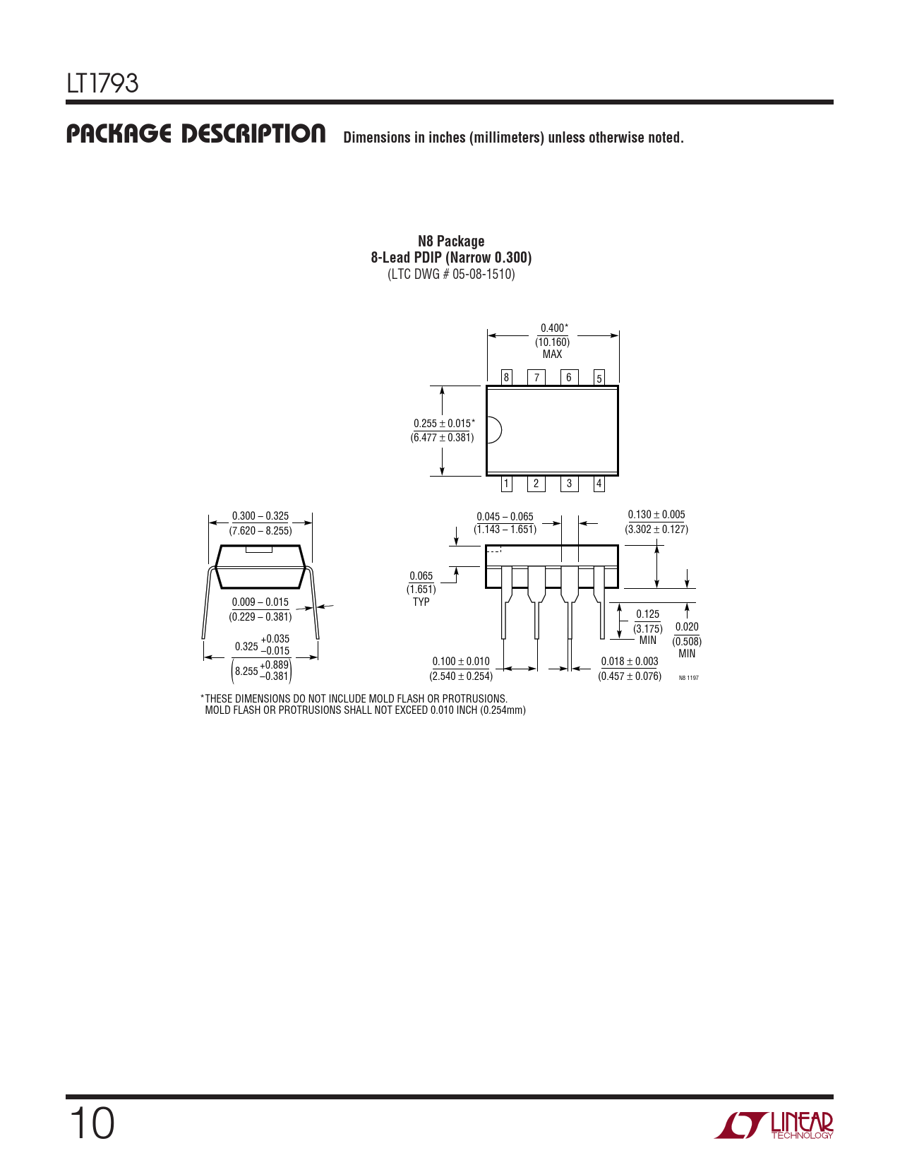 (LTC DWG # 05-08-1510) 0.400* (10.160) MAX 8 7 6 5 0.255 ± 0.015* (6.477 ± 0.381) 1 2 3 4 0.300 – 0.325 0.045 – 0.065 0.130 ± 0.005 (7.620 – 8.255) (1.143 – 1.651) (3.302 ± 0.127) 0.065 (1.651) 0.009 – 0.015 TYP 0.125 (0.229 – 0.381) (3.175) 0.020 +0.035 MIN (0.508) 0.325 –0.015 MIN 0.100 ± 0.010 0.018 ± 0.003 +0.889 8.255 ( ) –0.381 (2.540 ± 0.254) (0.457 ± 0.076) N8 1197 *THESE DIMENSIONS DO NOT INCLUDE MOLD FLASH OR PROTRUSIONS. MOLD FLASH OR PROTRUSIONS SHALL NOT EXCEED 0.010 INCH (0.254mm) 10