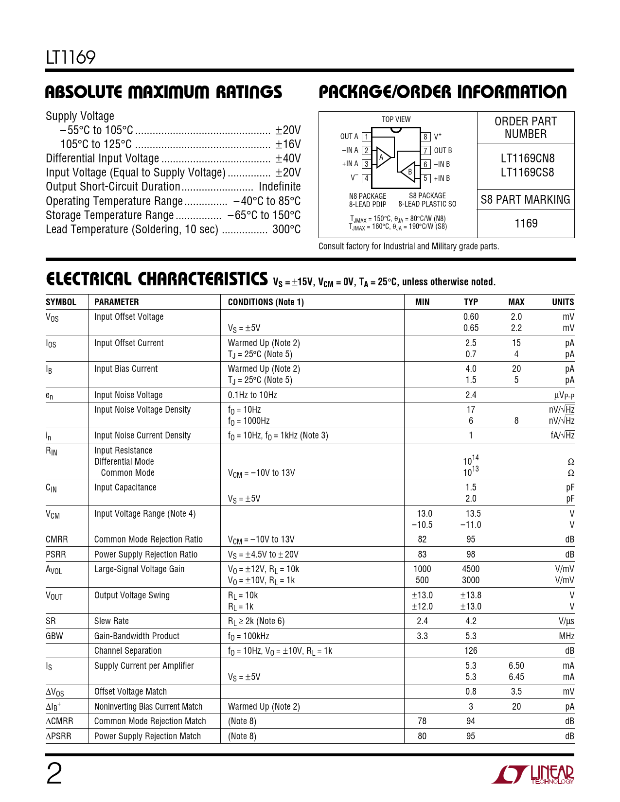 Supply Voltage TOP VIEW ORDER PART – 55°C to 105°C ... ±20V OUT A 1 8 V+ NUMBER 105°C to 125°C ... ±16V –IN A 2 7 OUT B Differential Input Voltage .. ±40V A LT1169CN8 +IN A 3 6 –IN B Input Voltage (Equal to Supply Voltage) ... ±20V B LT1169CS8 V– 4 5 +IN B Output Short-Circuit Duration... Indefinite Operating Temperature Range ... – 40°C to 85°C N8 PACKAGE S8 PACKAGE S8 PART MARKING 8-LEAD PDIP 8-LEAD PLASTIC SO Storage Temperature Range .. – 65°C to 150°C TJMAX = 150°C, θJA = 80°C/W (N8) Lead Temperature (Soldering, 10 sec) .. 300°C T 1169 JMAX = 160°C, θJA = 190°C/W (S8) Consult factory for Industrial and Military grade parts.