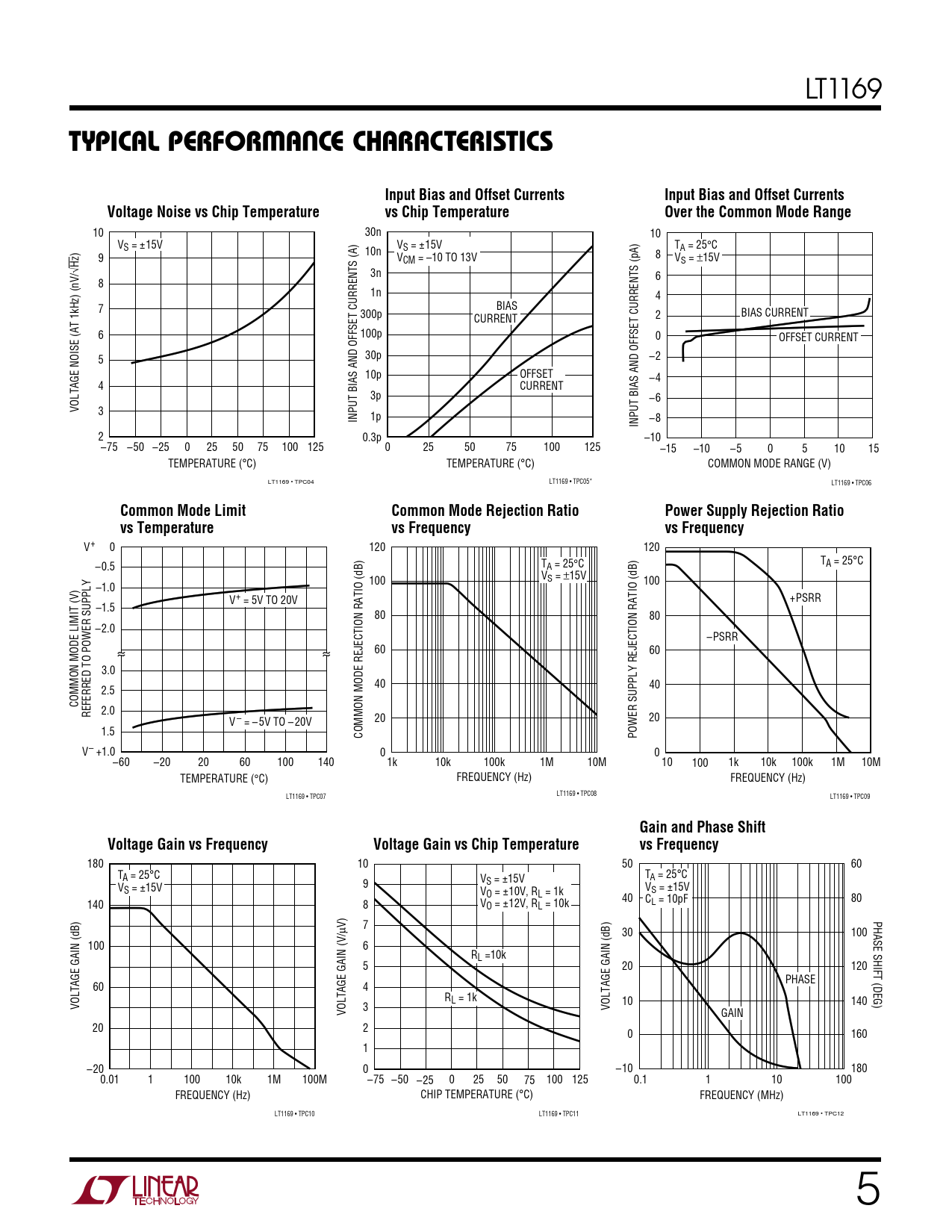 180 10 50 60 TA = 25°C V T S = ±15V A = 25°C V 9 S = ±15V V V O = ±10V, RL = 1k S = ±15V 40 C 80 140 8 VO = ±12V, RL = 10k L = 10pF PHASE SHIFT (DEG) 7 µV) 30 100 100 6 RL =10k 5 20 120 PHASE 60 4 RL = 1k VOLTAGE GAIN (dB) 10 140 3 VOLTAGE GAIN (dB) VOLTAGE GAIN (V/ GAIN 20 2 0 160 1 –20 0 –10 180 0.01 1 100 10k 1M 100M –75 –50 –25 0 25 50 75 100 125 0.1 1 10 100 FREQUENCY (Hz) CHIP TEMPERATURE (°C) FREQUENCY (MHz) LT1169 • TPC10 LT1169 • TPC11 LT1169 • TPC12 5