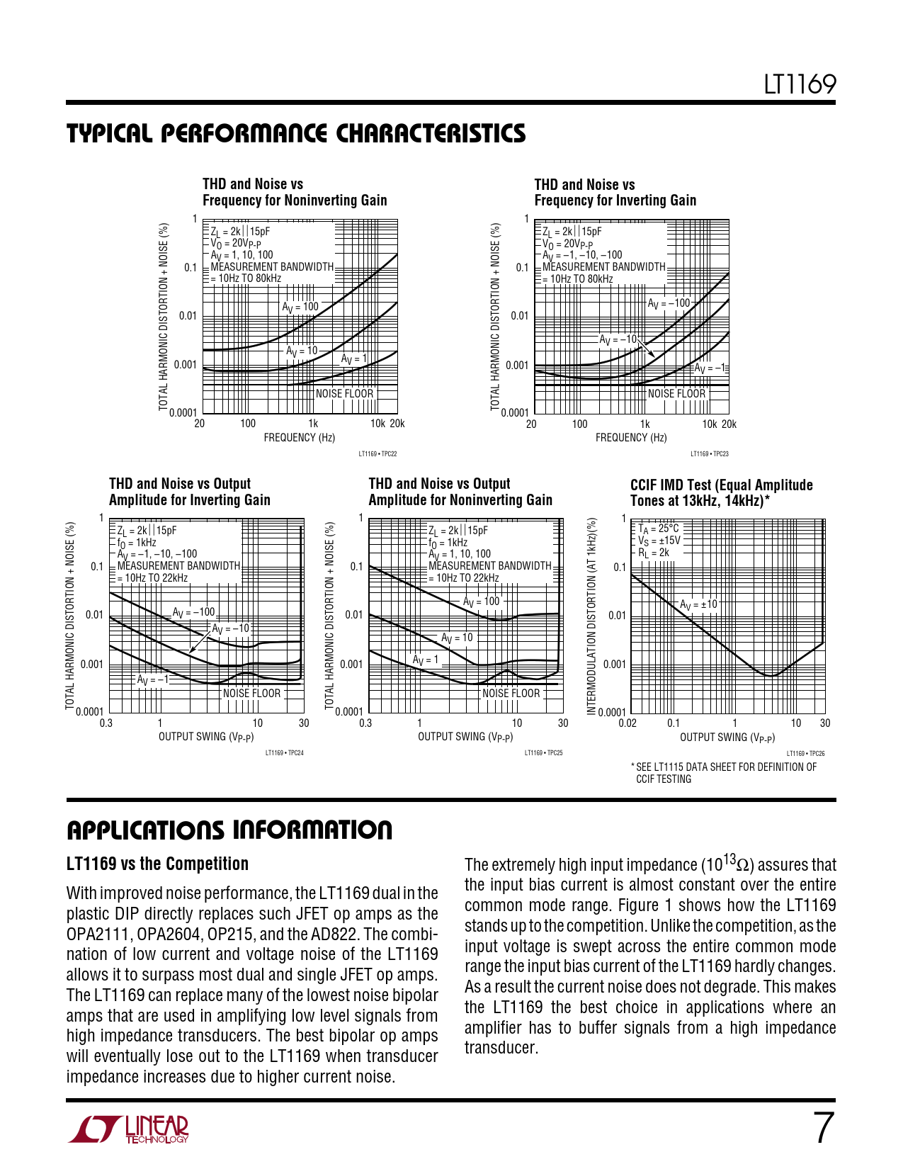 1 1 1 T Z Z A = 25°C L = 2k15pF L = 2k15pF V f f S = ±15V O = 1kHz O = 1kHz R A A L = 2k V = –1, –10, –100 V = 1, 10, 100 0.1 MEASUREMENT BANDWIDTH 0.1 MEASUREMENT BANDWIDTH 0.1 = 10Hz TO 22kHz = 10Hz TO 22kHz AV = 100 AV = ±10 0.01 AV = –100 0.01 0.01 AV = –10 AV = 10 0.001 0.001 AV = 1 0.001 AV = –1 NOISE FLOOR NOISE FLOOR TOTAL HARMONIC DISTORTION + NOISE (%) TOTAL HARMONIC DISTORTION + NOISE (%) 0.0001 0.0001 INTERMODULATION DISTORTION (AT 1kHz)(%) 0.0001 0.3 1 10 30 0.3 1 10 30 0.02 0.1 1 10 30 OUTPUT SWING (V OUTPUT SWING (V P-P) P-P) OUTPUT SWING (VP-P) LT1169 • TPC24 LT1169 • TPC25 LT1169 • TPC26 * SEE LT1115 DATA SHEET FOR DEFINITION OF CCIF TESTING