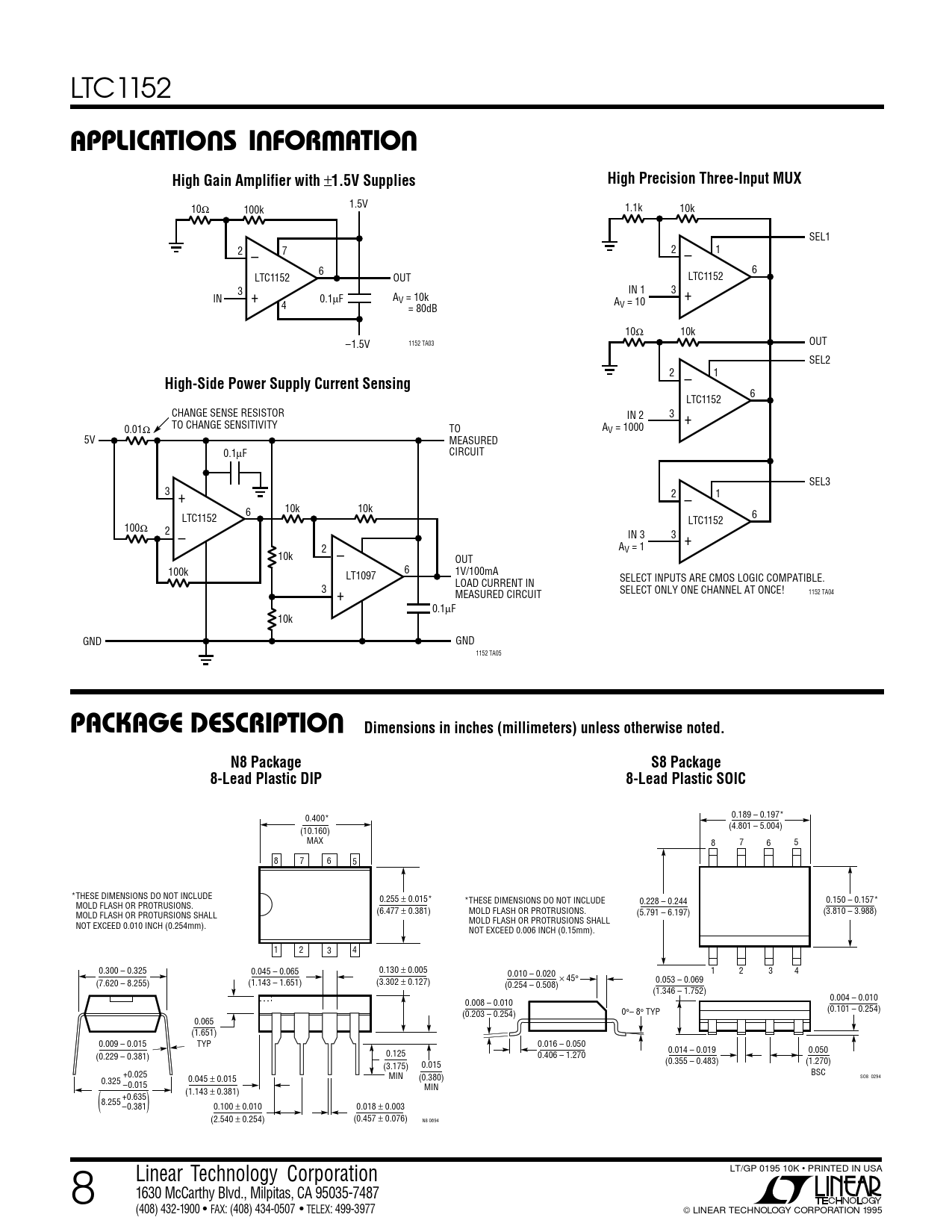 0.400* 0.189 – 0.197* (4.801 – 5.004) (10.160) MAX 8 7 6 5 8 7 6 5 *THESE DIMENSIONS DO NOT INCLUDE 0.255 ± 0.015* *THESE DIMENSIONS DO NOT INCLUDE 0.228 – 0.244 0.150 – 0.157* MOLD FLASH OR PROTRUSIONS. (6.477 ± 0.381) MOLD FLASH OR PROTRUSIONS. (5.791 – 6.197) (3.810 – 3.988) MOLD FLASH OR PROTURSIONS SHALL MOLD FLASH OR PROTRUSIONS SHALL NOT EXCEED 0.010 INCH (0.254mm). NOT EXCEED 0.006 INCH (0.15mm). 1 2 3 4 0.300 – 0.325 0.045 – 0.065 0.130 ± 0.005 1 2 3 4 0.010 – 0.020 × 45° (7.620 – 8.255) (1.143 – 1.651) (3.302 ± 0.127) 0.053 – 0.069 (0.254 – 0.508) (1.346 – 1.752) 0.004 – 0.010 0.008 – 0.010 (0.101 – 0.254) 0 (0.203 – 0.254) °– 8° TYP 0.065 (1.651) 0.009 – 0.015 TYP 0.016 – 0.050 0.050 0.125 0.014 – 0.019 (0.229 – 0.381) 0.406 – 1.270 (0.355 – 0.483) (1.270) (3.175) 0.015 +0.025 BSC 0.045 SO8 0294 0.325 ± 0.015 MIN (0.380) –0.015 MIN (1.143 ± 0.381) +0.635 8.255 ( ) –0.381 0.100 ± 0.010 0.018 ± 0.003 (2.540 ± 0.254) (0.457 ± 0.076) N8 0694 LT/GP 0195 10K • PRINTED IN USA 8 Linear Technology Corporation 1630 McCarthy Blvd., Milpitas, CA 95035-7487 (408) 432-1900 ● FAX: (408) 434-0507 ● TELEX: 499-3977 LINEAR TECHNOLOGY CORPORATION 1995