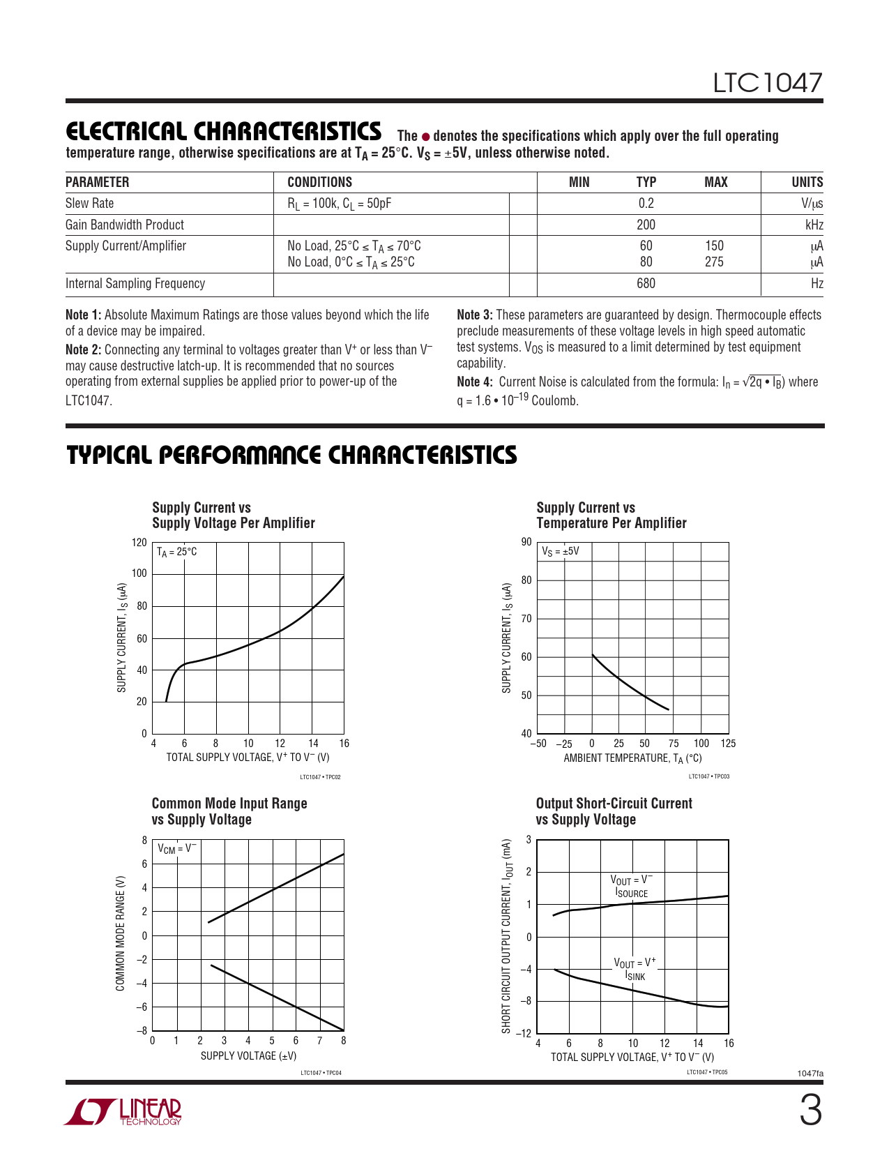 8 3 VCM = V– (mA) 6 OUT 2 VOUT = V– 4 ISOURCE 1 2 0 0 –2 V –4 OUT = V + ISINK COMMON MODE RANGE (V) –4 –8 –6 –8 SHORT CIRCUIT OUTPUT CURRENT, I –12 0 1 2 3 4 5 6 7 8 4 6 8 10 12 14 16 SUPPLY VOLTAGE (±V) TOTAL SUPPLY VOLTAGE, V+ TO V– (V) LTC1047 • TPC04 LTC1047 • TPC05 1047fa 3
