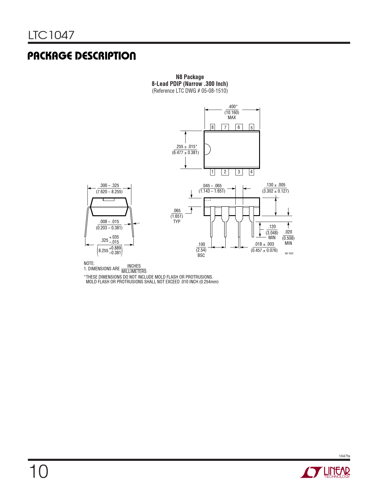 (Reference LTC DWG # 05-08-1510) .400* (10.160) MAX 8 7 6 5 .255 ± .015* (6.477 ± 0.381) 1 2 3 4 .300 – .325 .045 – .065 .130 ± .005 (7.620 – 8.255) (1.143 – 1.651) (3.302 ± 0.127) .065 (1.651) .008 – .015 TYP .120 (0.203 – 0.381) (3.048) .020 +.035 MIN (0.508) .325 –.015 MIN .100 .018 ± .003 +0.889 8.255 (2.54) (0.457 ± 0.076) –0.381 ( ) N8 1002 BSC NOTE: INCHES 1. DIMENSIONS ARE MILLIMETERS *THESE DIMENSIONS DO NOT INCLUDE MOLD FLASH OR PROTRUSIONS. MOLD FLASH OR PROTRUSIONS SHALL NOT EXCEED .010 INCH (0.254mm) 1047fa 10