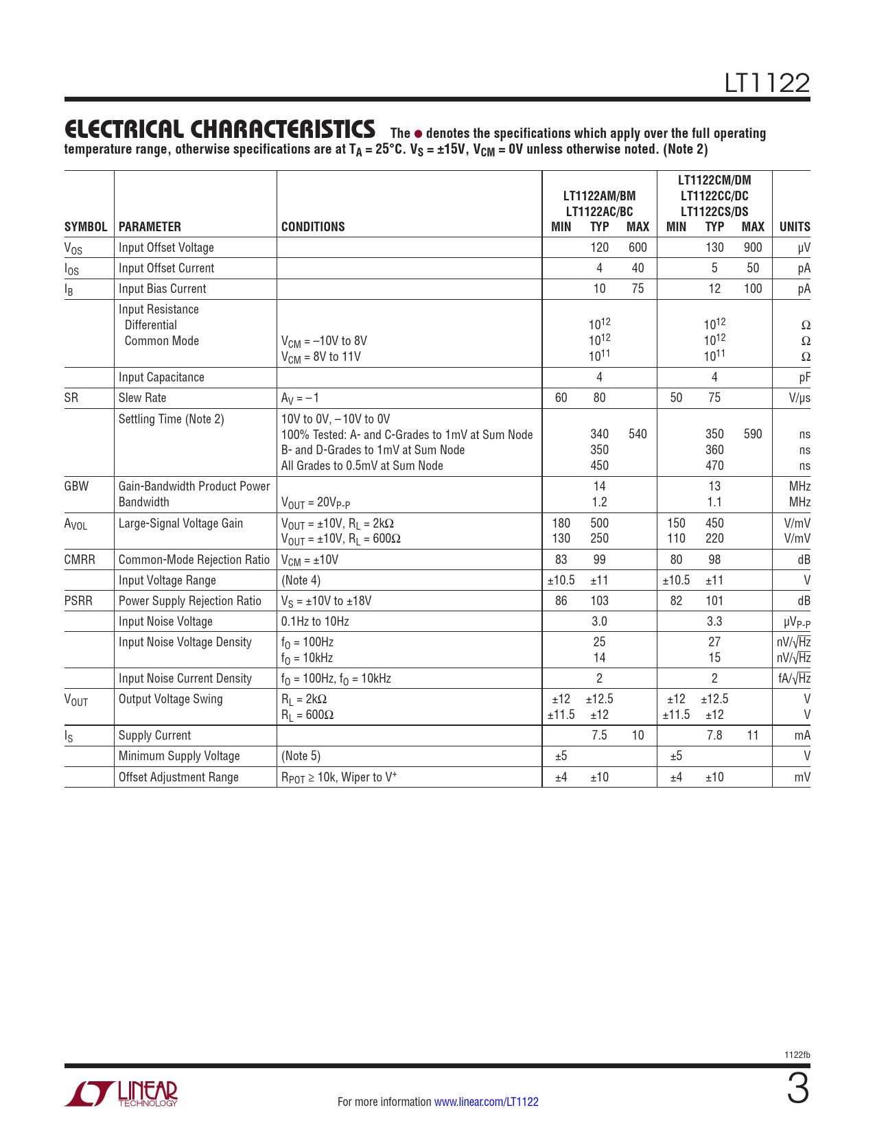 LT1122 ELECTRICALCHARACTERISTICS The l denotes the specifications which apply over the full operatingtemperature range, otherwise specifications are at TA = 25°C. VS = ±15V, VCM = 0V unless otherwise noted. (Note 2)LT1122CM/DMLT1122AM/BMLT1122CC/DCLT1122AC/BCLT1122CS/DSSYMBOL PARAMETERCONDITIONSMINTYPMAXMINTYPMAX UNITS VOS Input Offset Voltage 120 600 130 900 µV IOS Input Offset Current 4 40 5 50 pA IB Input Bias Current 10 75 12 100 pA Input Resistance Differential 1012 1012 Ω Common Mode VCM = –10V to 8V 1012 1012 Ω VCM = 8V to 11V 1011 1011 Ω Input Capacitance 4 4 pF SR Slew Rate AV = – 1 60 80 50 75 V/µs Settling Time (Note 2) 10V to 0V, – 10V to 0V 100% Tested: A- and C-Grades to 1mV at Sum Node 340 540 350 590 ns B- and D-Grades to 1mV at Sum Node 350 360 ns All Grades to 0.5mV at Sum Node 450 470 ns GBW Gain-Bandwidth Product Power 14 13 MHz Bandwidth VOUT = 20VP-P 1.2 1.1 MHz AVOL Large-Signal Voltage Gain VOUT = ±10V, RL = 2kΩ 180 500 150 450 V/mV VOUT = ±10V, RL = 600Ω 130 250 110 220 V/mV CMRR Common-Mode Rejection Ratio VCM = ±10V 83 99 80 98 dB Input Voltage Range (Note 4) ±10.5 ±11 ±10.5 ±11 V PSRR Power Supply Rejection Ratio VS = ±10V to ±18V 86 103 82 101 dB Input Noise Voltage 0.1Hz to 10Hz 3.0 3.3 µVP-P Input Noise Voltage Density fO = 100Hz 25 27 nV/√Hz fO = 10kHz 14 15 nV/√Hz Input Noise Current Density fO = 100Hz, fO = 10kHz 2 2 fA/√Hz VOUT Output Voltage Swing RL = 2kΩ ±12 ±12.5 ±12 ±12.5 V RL = 600Ω ±11.5 ±12 ±11.5 ±12 V IS Supply Current 7.5 10 7.8 11 mA Minimum Supply Voltage (Note 5) ±5 ±5 V Offset Adjustment Range RPOT ≥ 10k, Wiper to V+ ±4 ±10 ±4 ±10 mV 1122fb For more information www.linear.com/LT1122 3