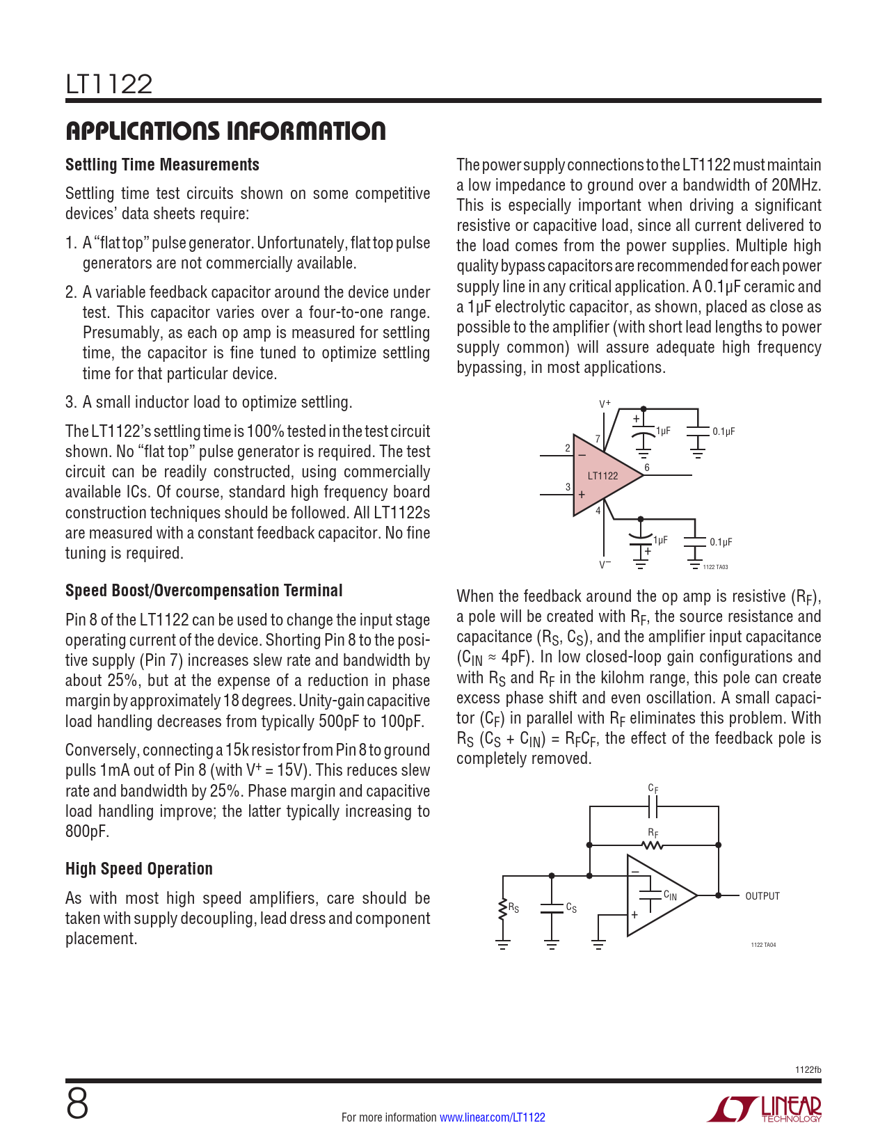 When the feedback around the op amp is resistive (RF), Pin 8 of the LT1122 can be used to change the input stage a pole will be created with RF, the source resistance and operating current of the device. Shorting Pin 8 to the posi- capacitance (RS, CS), and the amplifier input capacitance tive supply (Pin 7) increases slew rate and bandwidth by (CIN ≈ 4pF). In low closed-loop gain configurations and about 25%, but at the expense of a reduction in phase with RS and RF in the kilohm range, this pole can create margin by approximately 18 degrees. Unity-gain capacitive excess phase shift and even oscillation. A small capaci- load handling decreases from typically 500pF to 100pF. tor (CF) in parallel with RF eliminates this problem. With R Conversely, connecting a 15k resistor from Pin 8 to ground S (CS + CIN) = RFCF, the effect of the feedback pole is completely removed. pulls 1mA out of Pin 8 (with V+ = 15V). This reduces slew rate and bandwidth by 25%. Phase margin and capacitive CF load handling improve; the latter typically increasing to 800pF. RF
