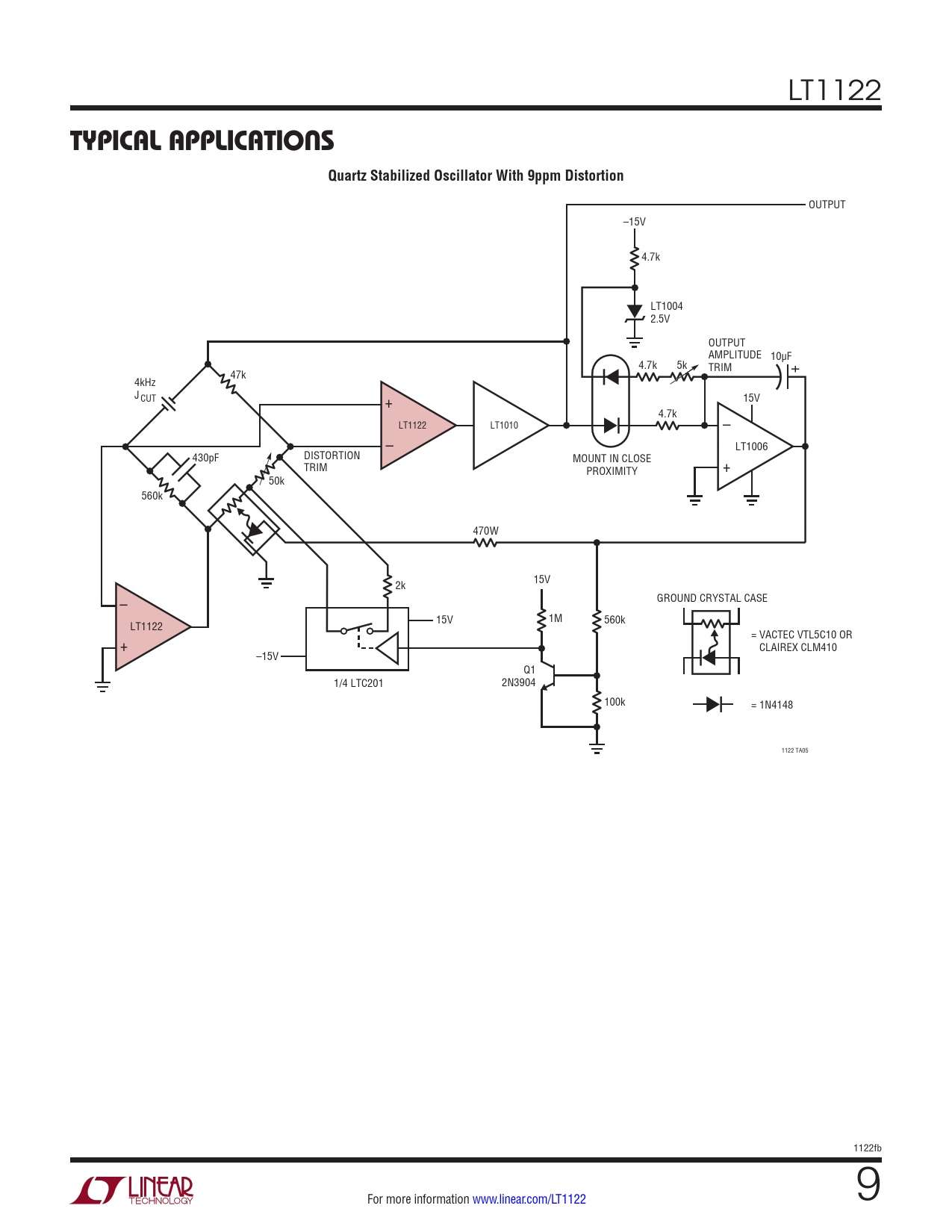 OUTPUT –15V 4.7k LT1004 2.5V OUTPUT AMPLITUDE 10µF 4.7k 5k + TRIM 47k 4kHz J CUT + 15V 4.7k LT1122 LT1010 – – LT1006 430pF DISTORTION MOUNT IN CLOSE TRIM PROXIMITY + 50k 560k 470W 2k 15V GROUND CRYSTAL CASE – 15V 1M LT1122 560k = VACTEC VTL5C10 OR + CLAIREX CLM410 –15V Q1 1/4 LTC201 2N3904 100k = 1N4148 1122 TA05 1122fb For more information www.linear.com/LT1122 9