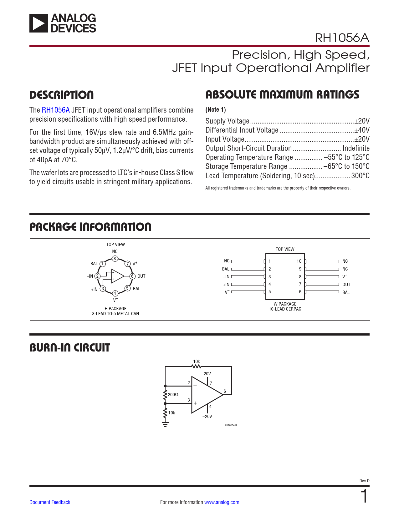 Datasheet RH1056A Analog Devices, Revision: D