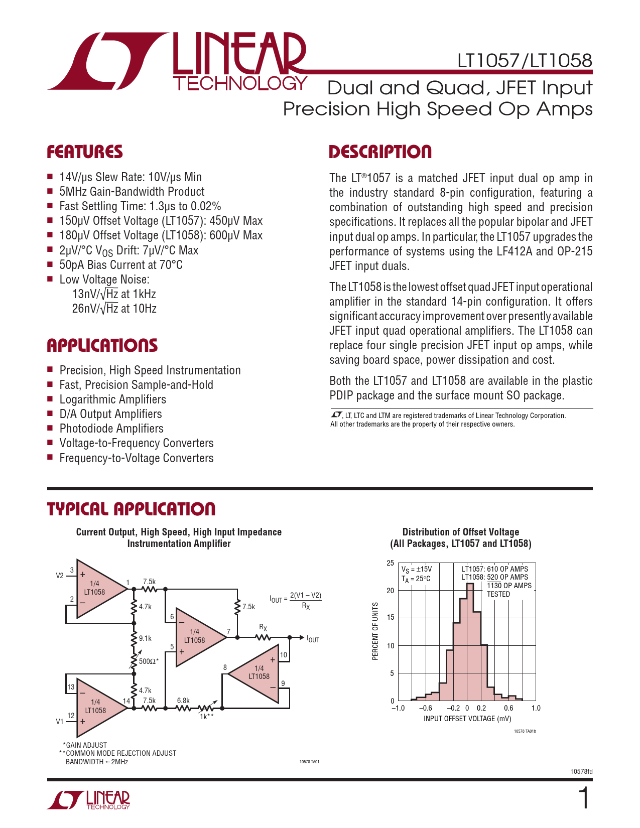 replace four single precision JFET input op amps, while saving board space, power dissipation and cost. n Precision, High Speed Instrumentation n Both the LT1057 and LT1058 are available in the plastic Fast, Precision Sample-and-Hold n PDIP package and the surface mount SO package. Logarithmic Amplifiers n D/A Output Amplifiers , LT, LTC and LTM are registered trademarks of Linear Technology Corporation. All other trademarks are the property of their respective owners. n Photodiode Amplifiers n Voltage-to-Frequency Converters n Frequency-to-Voltage Converters