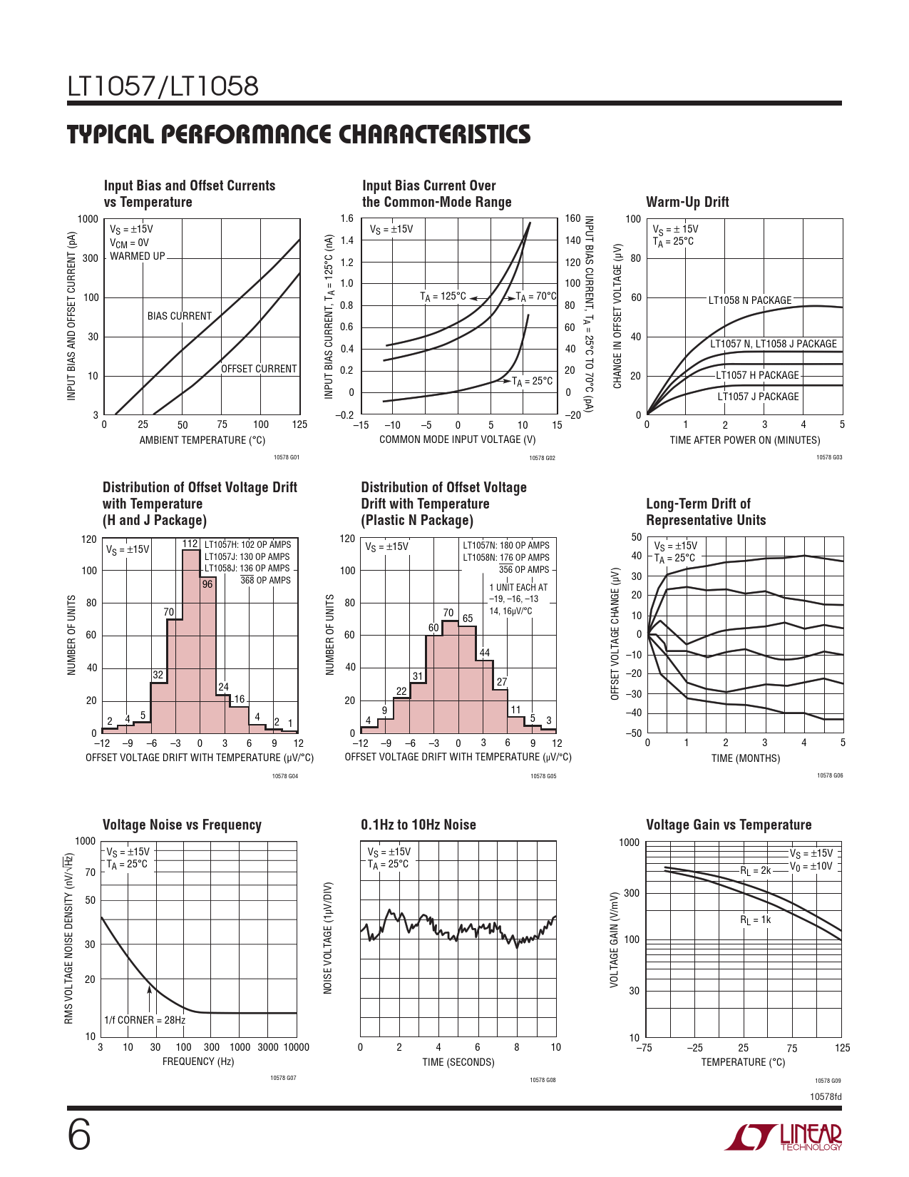 120 112 120 50 V V V S = ±15V LT1057H: 102 OP AMPS S = ±15V LT1057N: 180 OP AMPS S = ±15V LT1057J: 130 OP AMPS LT1058N: 176 OP AMPS 40 TA = 25°C 100 LT1058J: 136 OP AMPS 100 356 OP AMPS 30 96 368 OP AMPS 1 UNIT EACH AT 20 80 80 –19, –16, –13 70 70 14, 16µV/°C 65 10 60 60 60 0 44 –10 NUMBER OF UNITS 40 40 32 NUMBER OF UNITS 31 –20 24 27 22 –30 20 16 20 OFFSET VOLTAGE CHANGE (µV) 5 9 11 4 4 –40 2 2 1 4 5 3 0 0 –50 –12 –9 –6 –3 0 3 6 9 12 –12 –9 –6 –3 0 3 6 9 12 0 1 2 3 4 5 OFFSET VOLTAGE DRIFT WITH TEMPERATURE (µV/°C) OFFSET VOLTAGE DRIFT WITH TEMPERATURE (µV/°C) TIME (MONTHS) 10578 G04 10578 G05 10578 G06