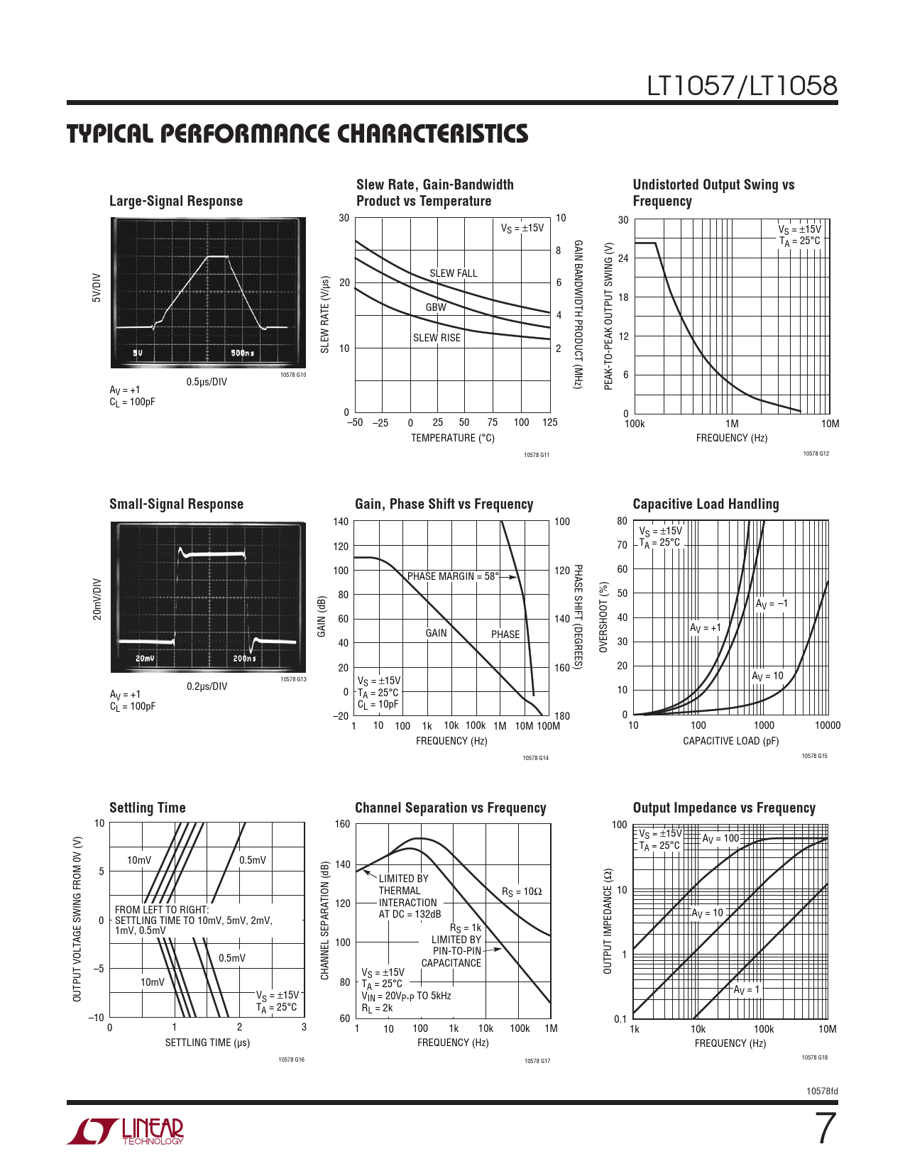 140 100 80 VS = ±15V 120 70 TA = 25°C PHASE SHIFT (DEGREES) 100 120 60 PHASE MARGIN = 58° /DIV 80 50 AV = –1 20mV 60 140 40 GAIN (dB) GAIN A PHASE V = +1 40 30 OVERSHOOT (%) 20 160 20 A 10578 G13 V = 10 0.2µs/DIV VS = ±15V A 10 V = +1 0 TA = 25°C CL = 100pF CL = 10pF –20 180 0 1 10 100 1k 10k 100k 1M 10M 100M 10 100 1000 10000 FREQUENCY (Hz) CAPACITIVE LOAD (pF) 10578 G14 10578 G15