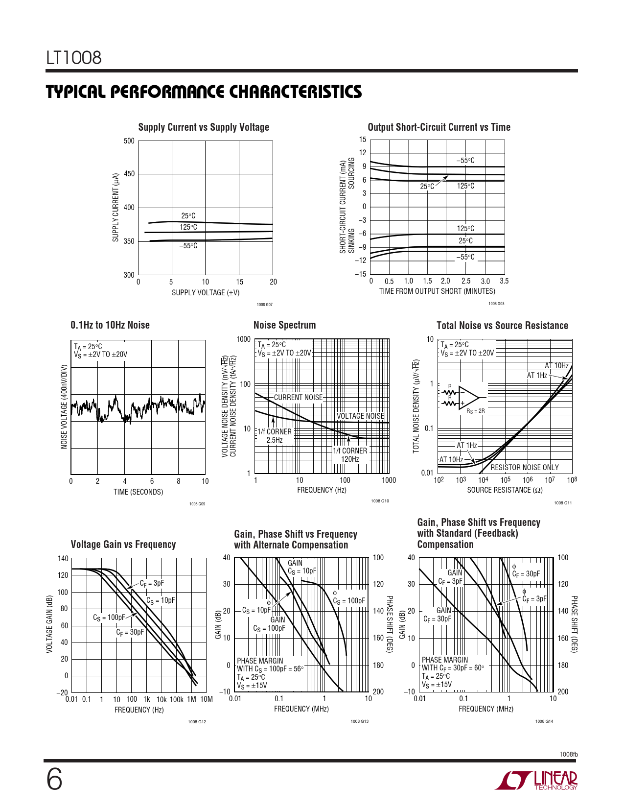 LT1008 WUTYPICAL PERFOR A CE CHARACTERISTICSSupply Current vs Supply VoltageOutput Short-Circuit Current vs Time 500 15 12 –55°C 9 450 μA) 6 SOURCING 25°C 125°C 3 400 0 25°C –3 125°C 125°C –6 SUPPLY CURRENT ( 350 25°C –55°C –9 SHORT-CIRCUIT CURRENT (mA) SINKING –12 –55°C 300 –15 0 5 10 15 20 0 0.5 1.0 1.5 2.0 2.5 3.0 3.5 SUPPLY VOLTAGE (±V) TIME FROM OUTPUT SHORT (MINUTES) 1008 G07 1008 G08 0.1Hz to 10Hz NoiseNoise SpectrumTotal Noise vs Source Resistance 1000 10 T T T A = 25°C A = 25°C A = 25°C V V V S = ±2V TO ±20V S = ±2V TO ±20V S = ±2V TO ±20V √Hz) √Hz) √Hz) AT 10Hz μV/ AT 1Hz 100 1 R – CURRENT NOISE R + RS = 2R VOLTAGE NOISE 10 0.1 1/f CORNER 2.5Hz NOISE VOLTAGE (400nV/DIV) AT 1Hz 1/f CORNER TOTAL NOISE DENSITY ( VOLTAGE NOISE DENSITY (nV/ CURRENT NOISE DENSITY (fA/ 120Hz AT 10Hz RESISTOR NOISE ONLY 1 0.01 0 2 4 6 8 10 1 10 100 1000 102 103 104 105 106 107 108 TIME (SECONDS) FREQUENCY (Hz) SOURCE RESISTANCE (Ω) 1008 G10 1008 G09 1008 G11 Gain, Phase Shift vs FrequencyGain, Phase Shift vs Frequencywith Standard (Feedback)Voltage Gain vs Frequencywith Alternate CompensationCompensation 140 40 100 40 100 GAIN φ C 120 S = 10pF GAIN CF = 30pF C C F = 3pF 30 120 30 F = 3pF 120 100 φ PHASE SHIFT (DEG) φ PHASE SHIFT (DEG) C C S = 10pF φ CS = 100pF F = 3pF 80 20 CS = 10pF 140 20 GAIN 140 CS = 100pF GAIN CF = 30pF 60 C C S = 100pF F = 30pF GAIN (dB) 10 160 GAIN (dB) 10 160 40 VOLTAGE GAIN (dB) 20 PHASE MARGIN PHASE MARGIN 0 180 0 180 WITH CS = 100pF = 56° WITH CF = 30pF = 60° 0 TA = 25°C TA = 25°C VS = ±15V VS = ±15V –20 –10 200 –10 200 0.01 0.1 1 10 100 1k 10k 100k 1M 10M 0.01 0.1 1 10 0.01 0.1 1 10 FREQUENCY (Hz) FREQUENCY (MHz) FREQUENCY (MHz) 1008 G12 1008 G13 1008 G14 1008fb 6