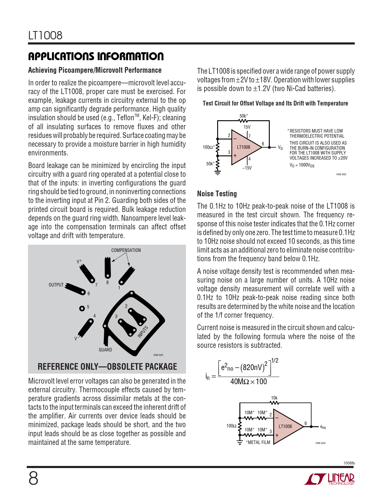 to the inverting input at Pin 2. Guarding both sides of the printed circuit board is required. Bulk leakage reduction The 0.1Hz to 10Hz peak-to-peak noise of the LT1008 is depends on the guard ring width. Nanoampere level leak- measured in the test circuit shown. The frequency re- age into the compensation terminals can affect offset sponse of this noise tester indicates that the 0.1Hz corner voltage and drift with temperature. is defined by only one zero. The test time to measure 0.1Hz to 10Hz noise should not exceed 10 seconds, as this time COMPENSATION limit acts as an additional zero to eliminate noise contribu- tions from the frequency band below 0.1Hz. V+ A noise voltage density test is recommended when mea- suring noise on a large number of units. A 10Hz noise 8 OUTPUT 7 1 voltage density measurement will correlate well with a 6 0.1Hz to 10Hz peak-to-peak noise reading since both 5 2 results are determined by the white noise and the location 4 3 of the 1/f corner frequency. Current noise is measured in the circuit shown and calcu- INPUTS lated by the following formula where the noise of the V– source resistors is subtracted. GUARD 1008 AI01 1/2