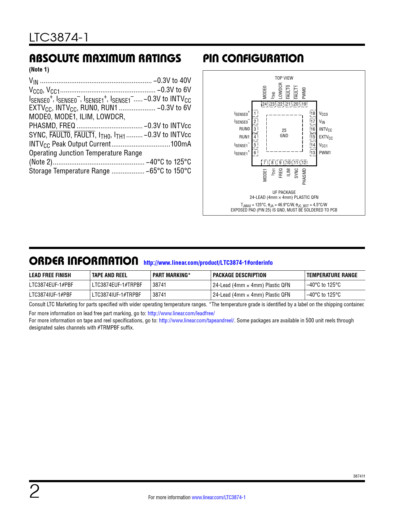 LTC3874-1 absoluTe MaxiMuM raTingspin conFiguraTion(Note 1) V TOP VIEW IN ... −0.3V to 40V VCC0, VCC1 .. −0.3V to 6V I + – + – SENSE0 , ISENSE0 , ISENSE1 , ISENSE1 ... −0.3V to INTVCC MODE0 I TH0 LOWDCR FAULT0 FAULT1 PWM0 EXTV 24 23 22 21 20 19 CC, INTVCC, RUN0, RUN1 .. −0.3V to 6V + MODE0, MODE1, ILIM, LOWDCR, ISENSE0 1 18 VCC0 – PHASMD, FREQ .. −0.3V to INTVcc ISENSE0 2 17 VIN RUN0 3 16 INTV SYNC, FAULT0, FAULT1, I 25 CC TH0, ITH1 ... −0.3V to INTVcc GND RUN1 4 15 EXTVCC INTVCC Peak Output Current ..100mA I – SENSE1 5 14 VCC1 Operating Junction Temperature Range I + SENSE1 6 13 PWM1 (Note 2) .. −40°C to 125°C 7 8 9 10 11 12 Storage Temperature Range .. −65°C to 150°C I TH1 FREQ ILIM SYNC MODE1 PHASMD UF PACKAGE 24-LEAD (4mm × 4mm) PLASTIC QFN TJMAX = 125°C, θJA = 46.9°C/W, θJC_BOT = 4.5°C/W EXPOSED PAD (PIN 25) IS GND, MUST BE SOLDERED TO PCB orDer inForMaTion http://www.linear.com/product/LTC3874-1#orderinfoLEAD FREE FINISHTAPE AND REELPART MARKING*PACKAGE DESCRIPTIONTEMPERATURE RANGE LTC3874EUF-1#PBF LTC3874EUF-1#TRPBF 38741 24-Lead (4mm × 4mm) Plastic QFN –40°C to 125°C LTC3874IUF-1#PBF LTC3874IUF-1#TRPBF 38741 24-Lead (4mm × 4mm) Plastic QFN –40°C to 125°C Consult LTC Marketing for parts specified with wider operating temperature ranges. *The temperature grade is identified by a label on the shipping container. For more information on lead free part marking, go to: http://www.linear.com/leadfree/ For more information on tape and reel specifications, go to: http://www.linear.com/tapeandreel/. Some packages are available in 500 unit reels through designated sales channels with #TRMPBF suffix. 38741f 2 For more information www.linear.com/LTC3874-1 Document Outline Features Applications Description Typical Application Absolute Maximum Ratings Pin Configuration Electrical Characteristics Typical Performance Characteristics Pin Functions Functional Block Diagram Operation Applications Information Typical Application Related Parts