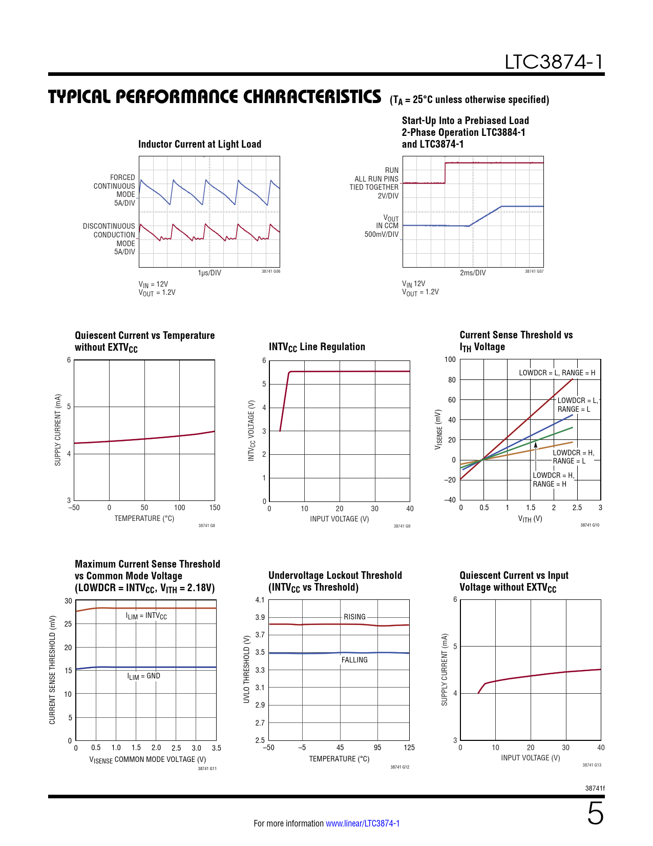 6 6 100 LOWDCR = L, RANGE = H 80 5 60 LOWDCR = L, 5 4 RANGE = L TAGE (V) (mV) 40 3 VOL 20 Y CURRENT (mA) V ISENSE V CC 4 LOWDCR = H, 2 INT 0 RANGE = L SUPPL LOWDCR = H, 1 –20 RANGE = H 3 0 –40 –50 0 50 100 150 0 10 20 30 40 0 0.5 1 1.5 2 2.5 3 TEMPERATURE (°C) INPUT VOLTAGE (V) VITH (V) 38741 G8 38741 G9 38741 G10