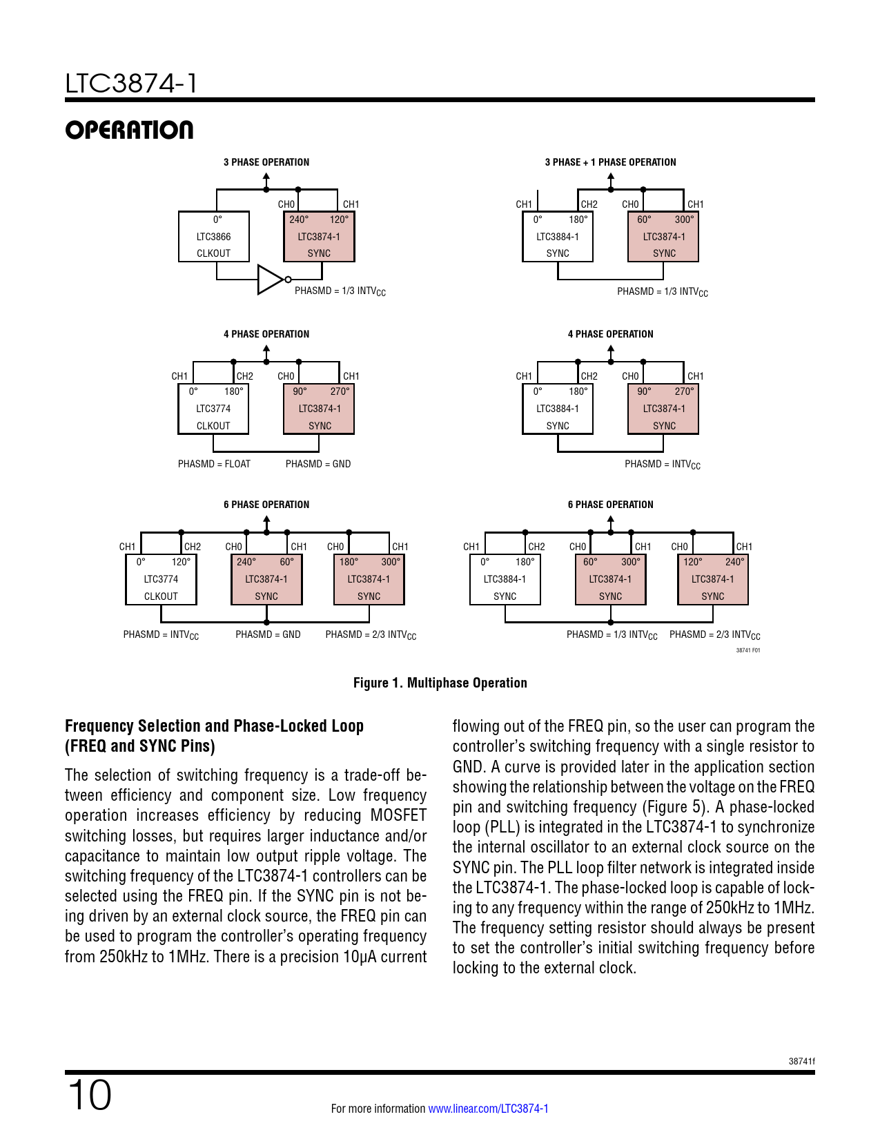CH1 CH2 CH0 CH1 CH0 CH1 CH1 CH2 CH0 CH1 CH0 CH1 0° 120° 240° 60° 180° 300° 0° 180° 60° 300° 120° 240° LTC3774 LTC3874-1 LTC3874-1 LTC3884-1 LTC3874-1 LTC3874-1 CLKOUT SYNC SYNC SYNC SYNC SYNC PHASMD = INTVCC PHASMD = GND PHASMD = 2/3 INTVCC PHASMD = 1/3 INTVCC PHASMD = 2/3 INTVCC 38741 F01