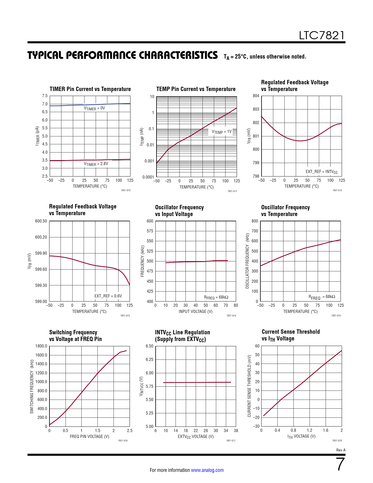 7.5 10 804 7.0 VTIMER = 0V 803 6.5 1 6.0 802 5.5 0.1 (µA) VTEMP = 1V 5.0 (nA) (mV) 801 I TIMER 4.5 I TEMP 0.01 V FB 800 4.0 3.5 0.001 VTIMER = 2.8V 799 3.0 EXT_REF = INTVCC 2.5 0.0001 798 –50 –25 0 25 50 75 100 125 –50 –25 0 25 50 75 100 125 –50 –25 0 25 50 75 100 125 TEMPERATURE (°C) TEMPERATURE (°C) TEMPERATURE (°C) 7821 G10 7821 G11 7821 G12