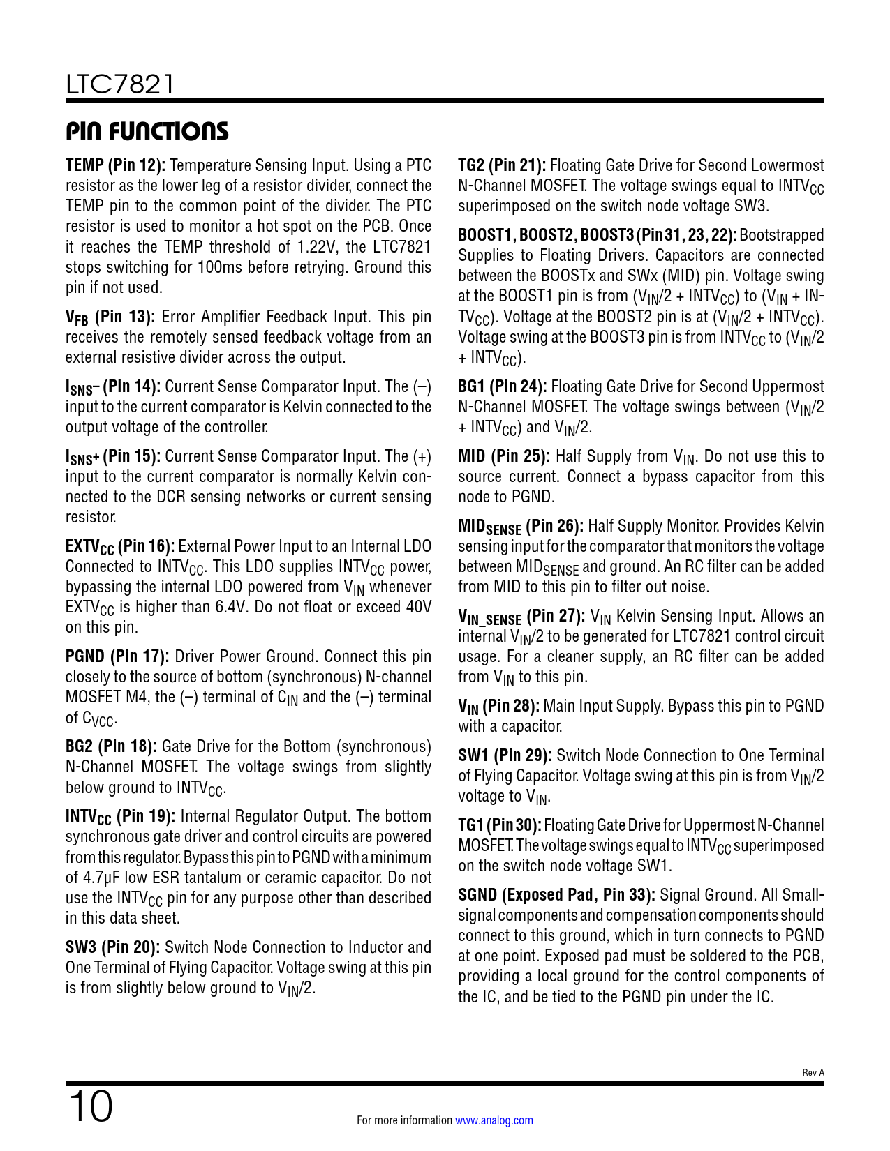 LTC7821 PIN FUNCTIONS TEMP (Pin 12): Temperature Sensing Input. Using a PTC TG2 (Pin 21): Floating Gate Drive for Second Lowermost resistor as the lower leg of a resistor divider, connect the N-Channel MOSFET. The voltage swings equal to INTVCC TEMP pin to the common point of the divider. The PTC superimposed on the switch node voltage SW3. resistor is used to monitor a hot spot on the PCB. Once BOOST1, BOOST2, BOOST3 (Pin 31, 23, 22): Bootstrapped it reaches the TEMP threshold of 1.22V, the LTC7821 Supplies to Floating Drivers. Capacitors are connected stops switching for 100ms before retrying. Ground this between the BOOSTx and SWx (MID) pin. Voltage swing pin if not used. at the BOOST1 pin is from (VIN/2 + INTVCC) to (VIN + IN- VFB (Pin 13): Error Amplifier Feedback Input. This pin TVCC). Voltage at the BOOST2 pin is at (VIN/2 + INTVCC). receives the remotely sensed feedback voltage from an Voltage swing at the BOOST3 pin is from INTVCC to (VIN/2 external resistive divider across the output. + INTVCC). ISNS– (Pin 14): Current Sense Comparator Input. The (–) BG1 (Pin 24): Floating Gate Drive for Second Uppermost input to the current comparator is Kelvin connected to the N-Channel MOSFET. The voltage swings between (VIN/2 output voltage of the controller. + INTVCC) and VIN/2. ISNS+ (Pin 15): Current Sense Comparator Input. The (+) MID (Pin 25): Half Supply from VIN. Do not use this to input to the current comparator is normally Kelvin con- source current. Connect a bypass capacitor from this nected to the DCR sensing networks or current sensing node to PGND. resistor. MIDSENSE (Pin 26): Half Supply Monitor. Provides Kelvin EXTVCC (Pin 16): External Power Input to an Internal LDO sensing input for the comparator that monitors the voltage Connected to INTVCC. This LDO supplies INTVCC power, between MIDSENSE and ground. An RC filter can be added bypassing the internal LDO powered from VIN whenever from MID to this pin to filter out noise. EXTVCC is higher than 6.4V. Do not float or exceed 40V V on this pin. IN_SENSE (Pin 27): VIN Kelvin Sensing Input. Allows an internal VIN/2 to be generated for LTC7821 control circuit PGND (Pin 17): Driver Power Ground. Connect this pin usage. For a cleaner supply, an RC filter can be added closely to the source of bottom (synchronous) N-channel from VIN to this pin. MOSFET M4, the (–) terminal of CIN and the (–) terminal V of C IN (Pin 28): Main Input Supply. Bypass this pin to PGND VCC. with a capacitor. BG2 (Pin 18): Gate Drive for the Bottom (synchronous) SW1 (Pin 29): Switch Node Connection to One Terminal N-Channel MOSFET. The voltage swings from slightly of Flying Capacitor. Voltage swing at this pin is from V below ground to INTV IN/2 CC. voltage to VIN. INTVCC (Pin 19): Internal Regulator Output. The bottom TG1 (Pin 30): Floating Gate Drive for Uppermost N-Channel synchronous gate driver and control circuits are powered MOSFET. The voltage swings equal to INTV from this regulator. Bypass this pin to PGND with a minimum CC superimposed on the switch node voltage SW1. of 4.7μF low ESR tantalum or ceramic capacitor. Do not use the INTVCC pin for any purpose other than described SGND (Exposed Pad, Pin 33): Signal Ground. All Small- in this data sheet. signal components and compensation components should connect to this ground, which in turn connects to PGND SW3 (Pin 20): Switch Node Connection to Inductor and at one point. Exposed pad must be soldered to the PCB, One Terminal of Flying Capacitor. Voltage swing at this pin providing a local ground for the control components of is from slightly below ground to VIN/2. the IC, and be tied to the PGND pin under the IC. Rev A 10 For more information www.analog.com Document Outline Features Applications Typical Application Description Absolute Maximum Ratings Order Information Pin Configuration Electrical Characteristics Typical Performance Characteristics Pin Functions Block Diagram Operation Applications Information Package Description Revision History Related Parts